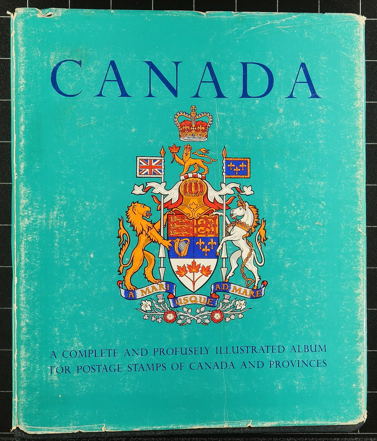 "Calling All Canada" albums lot, filling a bankers box. Includes a 3-volume set of Canada Wholesale Supply brand padded hingeless albums (Vol I, II, III) with pages from 1851-1992 (the pages have aged / yellowed, still usable, or just keep for the 3-ring binders). There are followed by a 4th empty 3-ring binder of the same make, then two Minkus green 3-ring binders (empty) and lastly an old-time Minkus Canada Album, with pages for Canadian Provinces. Estimate =