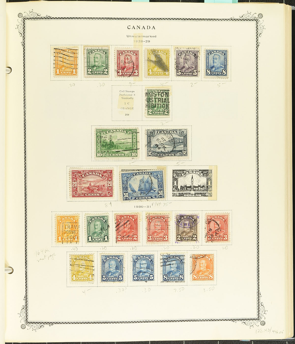 Starter collection of used Canada, 1857-1971, containing roughly 600 stamps in a Scott album. The collection ranges from Scott #15/557, with a few early issues, essentially starting with a few Small Queens, and partial sets of Leafs, Numerals, Edwards, Scrolls (including 50c Bluenose), along with complete sets of Admirals, Pictorial, War, and Peace issues. Also includes a small selection of back of the book issues and a few coil issues. A spot check indicated a few stamps cataloguing in the $10 range, along with a few small faults with a few of the stamps, still a nice start to an early Canada collection. Estimate =