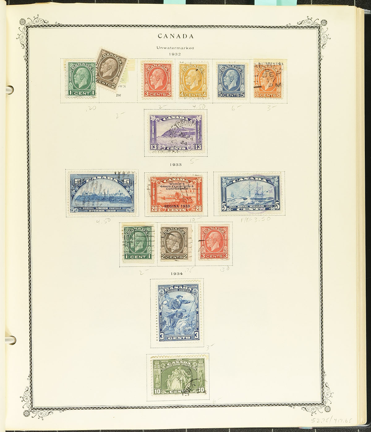 Starter collection of used Canada, 1857-1971, containing roughly 600 stamps in a Scott album. The collection ranges from Scott #15/557, with a few early issues, essentially starting with a few Small Queens, and partial sets of Leafs, Numerals, Edwards, Scrolls (including 50c Bluenose), along with complete sets of Admirals, Pictorial, War, and Peace issues. Also includes a small selection of back of the book issues and a few coil issues. A spot check indicated a few stamps cataloguing in the $10 range, along with a few small faults with a few of the stamps, still a nice start to an early Canada collection. Estimate =