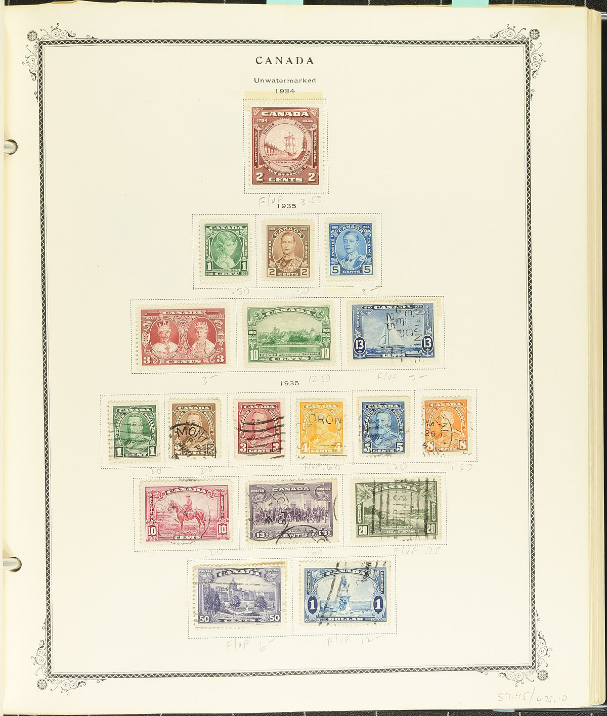 Starter collection of used Canada, 1857-1971, containing roughly 600 stamps in a Scott album. The collection ranges from Scott #15/557, with a few early issues, essentially starting with a few Small Queens, and partial sets of Leafs, Numerals, Edwards, Scrolls (including 50c Bluenose), along with complete sets of Admirals, Pictorial, War, and Peace issues. Also includes a small selection of back of the book issues and a few coil issues. A spot check indicated a few stamps cataloguing in the $10 range, along with a few small faults with a few of the stamps, still a nice start to an early Canada collection. Estimate =