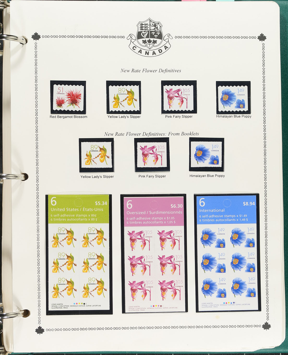 Lovely never hinged Canada collection, 2004-2008, containing many hundreds of stamps in hingeless album pages housed in a Minkus binder. The collection ranges from Unitrade #2072/2295, containing singles, sets, booklets, souvenir sheets, coils, die cuts, "P" stamps, etc., with the collection nearly complete from this transitional period. Some of the material will catalogue $10 and up each, face value alone at the time of counting was $376.00 (will be a touch higher currently as P stamps are now $1.24 each). A very clean lot for collectors, dealers, and postage users. Our online photos show a sampling. Estimate =