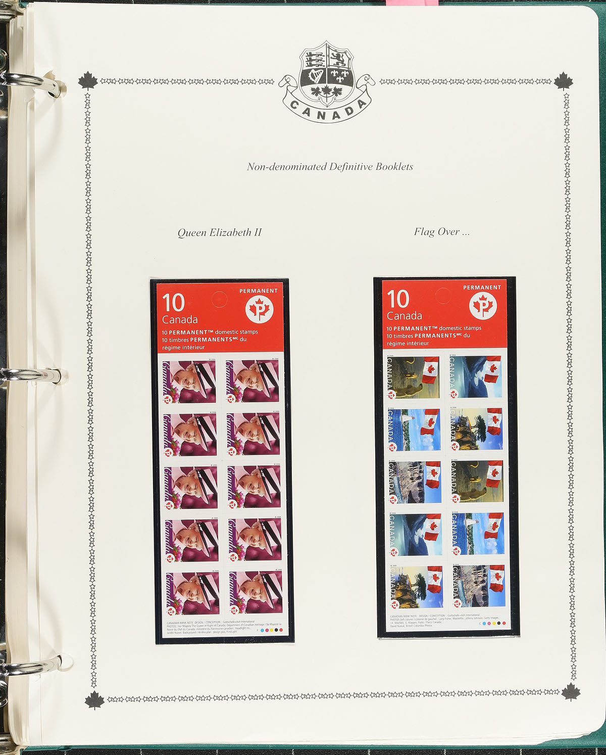 Lovely never hinged Canada collection, 2004-2008, containing many hundreds of stamps in hingeless album pages housed in a Minkus binder. The collection ranges from Unitrade #2072/2295, containing singles, sets, booklets, souvenir sheets, coils, die cuts, "P" stamps, etc., with the collection nearly complete from this transitional period. Some of the material will catalogue $10 and up each, face value alone at the time of counting was $376.00 (will be a touch higher currently as P stamps are now $1.24 each). A very clean lot for collectors, dealers, and postage users. Our online photos show a sampling. Estimate =