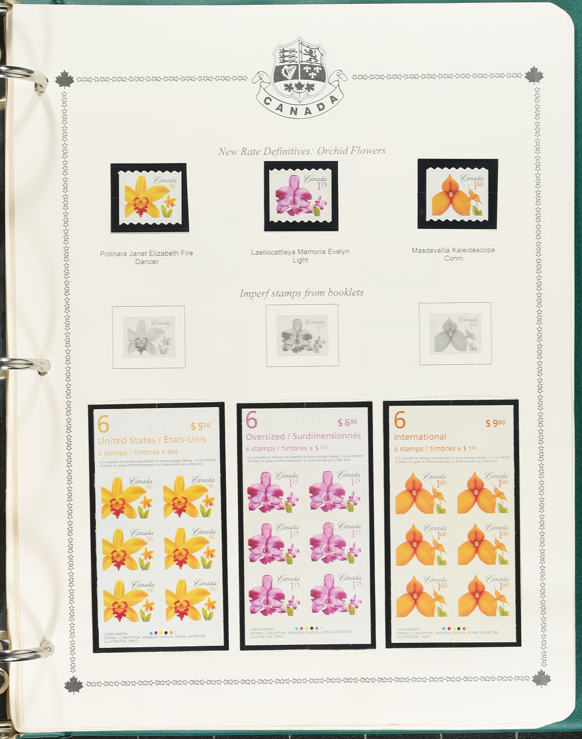 Lovely never hinged Canada collection, 2004-2008, containing many hundreds of stamps in hingeless album pages housed in a Minkus binder. The collection ranges from Unitrade #2072/2295, containing singles, sets, booklets, souvenir sheets, coils, die cuts, "P" stamps, etc., with the collection nearly complete from this transitional period. Some of the material will catalogue $10 and up each, face value alone at the time of counting was $376.00 (will be a touch higher currently as P stamps are now $1.24 each). A very clean lot for collectors, dealers, and postage users. Our online photos show a sampling. Estimate =