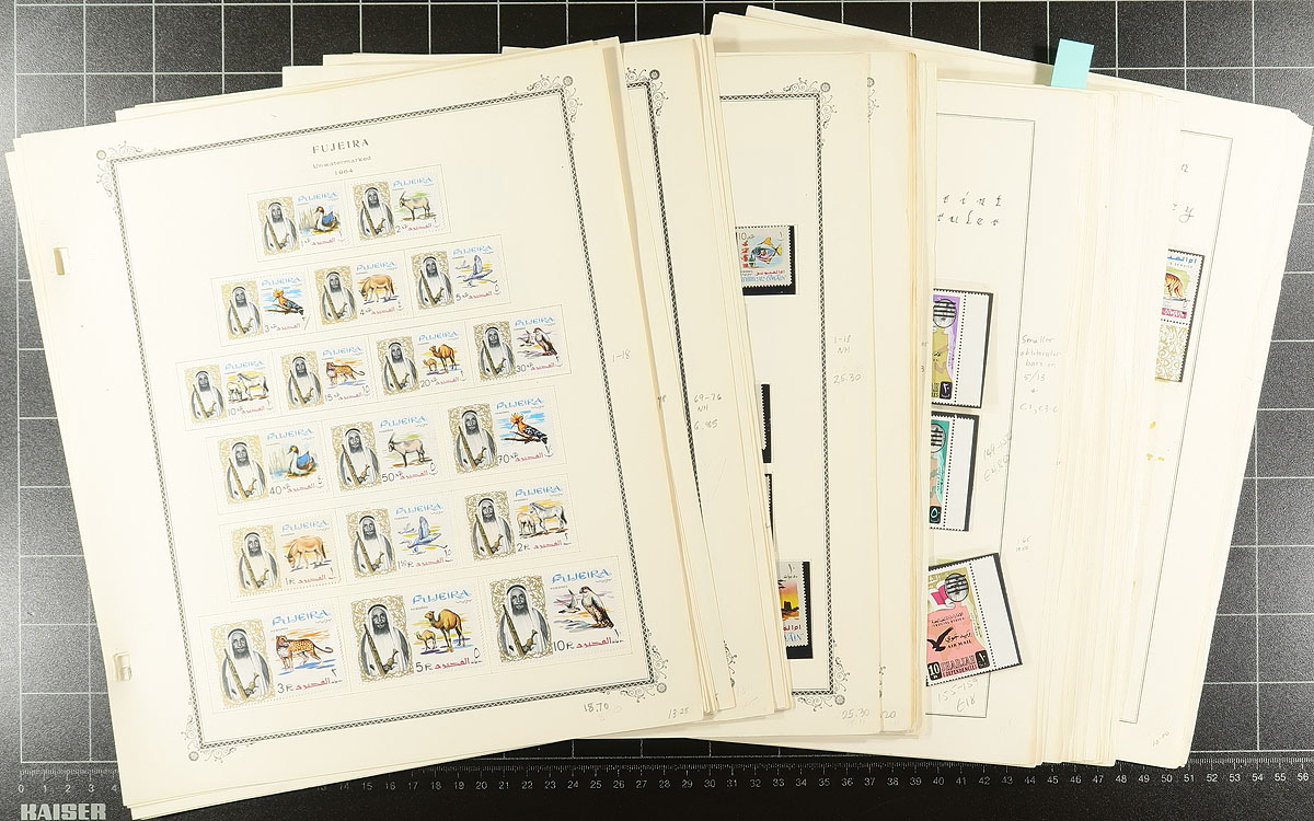 Nice collection of mint Fujeira and area, 1964-1968, containing many hundreds of stamps in several album pages. The collection contains representation from Fujeria, Sharjah, and Ummal Qiwain, noting several sets (both perforated and imperforate stamps), and a few souvenir sheets, with some sets cataloguing $10 to $20 each. A nice lot for topical and thematic collectors as we encountered suitable subjects including cats, dogs, flowers, birds, space and air travel, etc. Owner's catalogue value for the collection totals US$306.00 ($413.10 CDN). A nice clean lot ideal for all collectors. Estimate =
