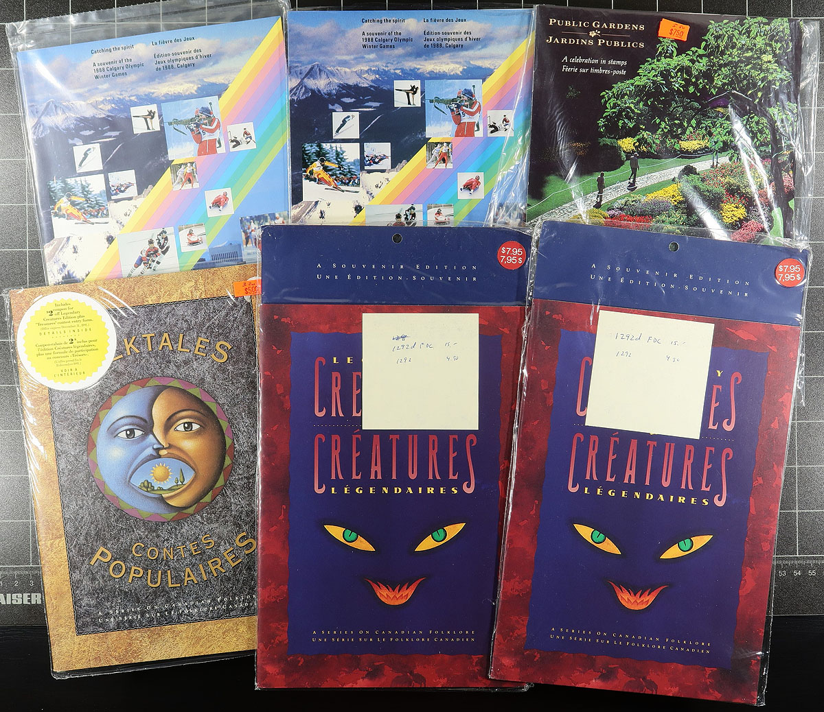 Nice group of Canada thematic collections, 1980's-1990's, containing 42 items including Unitrade #s 13, 15, 17-20, 22, 27, 28 (x2), 29-36, 38 (x2), 39, 40 (x2), 42, 46-47, 49 (x2), 50, 51 (x2), 52-53, 55, 57, 61, 62 (x2), 69, 76 (Series of the Century, which includes the overprinted souvenir sheet). A few of the collections catalogue $15 to $30 and up each. A lovely clean lot, with several items still in the original packaging. Very fine. 2025-2026 Unitrade =