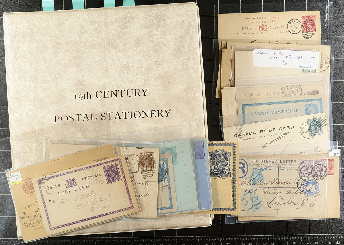 Interesting collection of early worldwide postal stationery, 1870's-1890's, containing roughly 100 pieces, most neatly organized in a "19th Century Postal Stationery" binder with homemade pages and some loose covers. The lot contains a nice variety of items, both used (primarily solo uses), and unused, noting UPU cards, letter cards, envelopes (variety of sizes), post cards, etc, with better representation from Germany and States, South America, along with other European and British Commonwealth countries. A nice lot for the specialist as some of these items would retail $5 and up each. A few corner faults on a few cards, overall fine to very fine. Estimate =