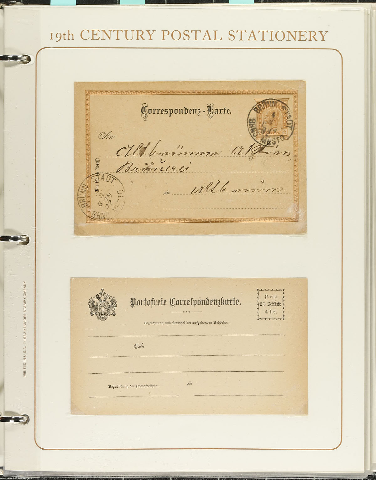 Interesting collection of early worldwide postal stationery, 1870's-1890's, containing roughly 100 pieces, most neatly organized in a "19th Century Postal Stationery" binder with homemade pages and some loose covers. The lot contains a nice variety of items, both used (primarily solo uses), and unused, noting UPU cards, letter cards, envelopes (variety of sizes), post cards, etc, with better representation from Germany and States, South America, along with other European and British Commonwealth countries. A nice lot for the specialist as some of these items would retail $5 and up each. A few corner faults on a few cards, overall fine to very fine. Estimate =
