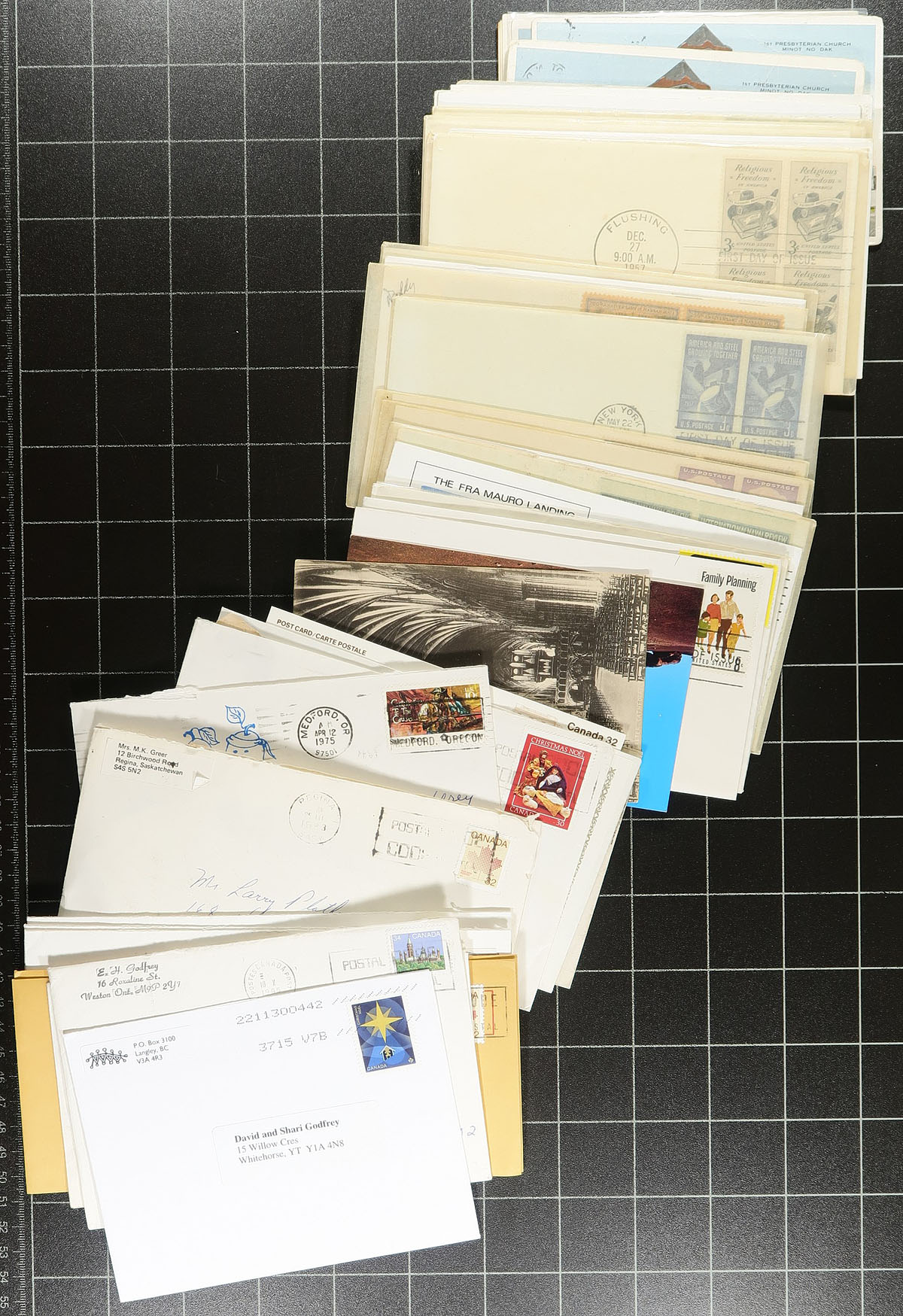 Accumulation of worldwide covers in a box, 1890's-1970's, containing roughly 500 items including postal stationery, post cards, first flights (Canada and the USA), first day covers, event covers, commerical covers, and more. The lot has a worldwide flavour but note better representation from Canada, USA, British Commonwealth and European countries. Many of the items are sleeved and ideal for the collector or dealer looking for dollar box items. A few faults with a few of the covers, overall fine to very fine. Estimate =