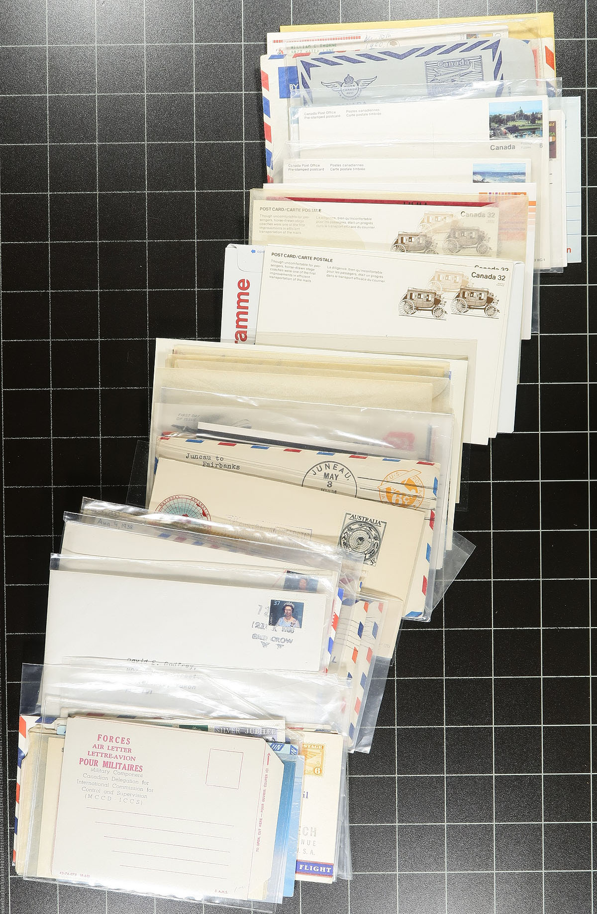Accumulation of worldwide covers in a box, 1890's-1970's, containing roughly 500 items including postal stationery, post cards, first flights (Canada and the USA), first day covers, event covers, commerical covers, and more. The lot has a worldwide flavour but note better representation from Canada, USA, British Commonwealth and European countries. Many of the items are sleeved and ideal for the collector or dealer looking for dollar box items. A few faults with a few of the covers, overall fine to very fine. Estimate =