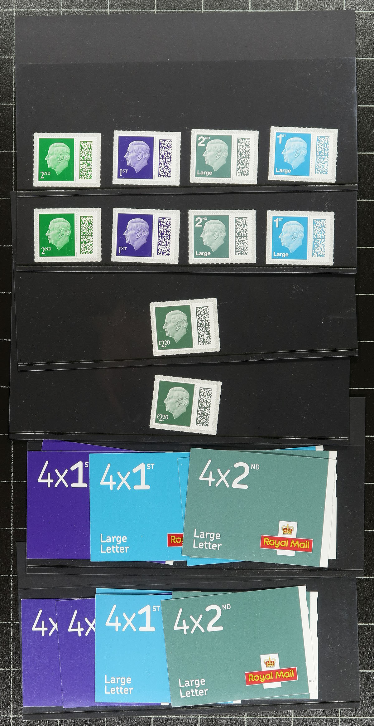 Lovely modern group of transitional Great Britain, 2022-2023, containing singles, booklet panes, and first day covers. The lot contains stamps near the end of Queen Elizabeth reign, with Scott #4194-4201 (10 strips in total), along with booklet panes of 2022 Machin stamps, and a group of King Charles III definitive issues, noting 1ST, 1st Large Letter, 2ND, and 2ND Large Letter issues. The lot rounds out with a few first day covers, including 3 numismatic covers (2 celebrating the new King Charles III Reign). Face value alone totaling £248.00 ($457.40 CDN). A super clean group for all collectors. Estimate =