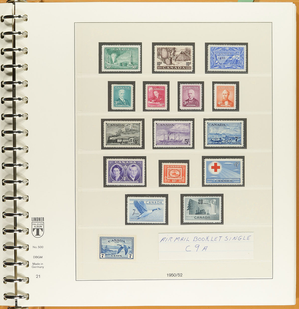 Hingeless Collection Part #1. Clean collection of never hinged Canada, in a Lindner album with slipcase. This is the first volume of a collection offered in several parts, with pages ranging from 1851 to 1971, along with pages for "back of the book" issues. The lot contains several hundreds of stamps beginning with a set of the Peace issues, and is fairly complete up to 1971, including Centennial varieties, a few booklet panes, and more. A few items catalogue $10 and up with a face value totaling $38.00, with the album retailing over $200.00 on its own. A nice clean lot that should be continued, very fine. Estimate =