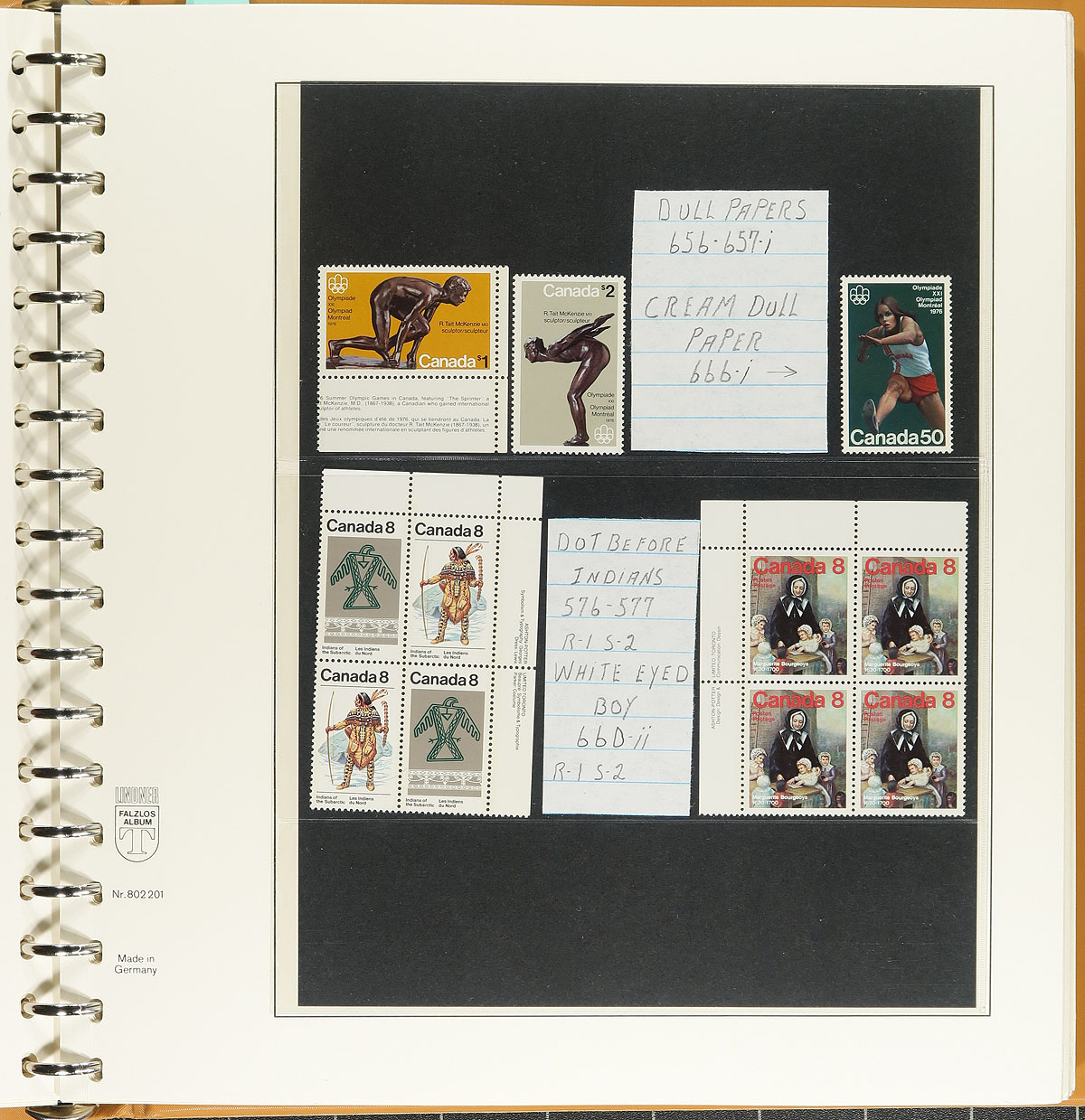 Hingeless Collection Part #2. Clean collection of never hinged Canada, in a Lindner album with slipcase, 1972-1985. This well organized collection ranges from Unitrade #562/1076, noting a high degree of completeness, with an attempt by the owner to include souvenir sheets, plate blocks, booklet panes, paper and tagging types, precancels, and minor varieties. A few items catalogue $10 and up with a face value alone totaling $195.00, with the album retailing over $200.00 on its own. A nice clean lot for collectors and dealers alike. Estimate =