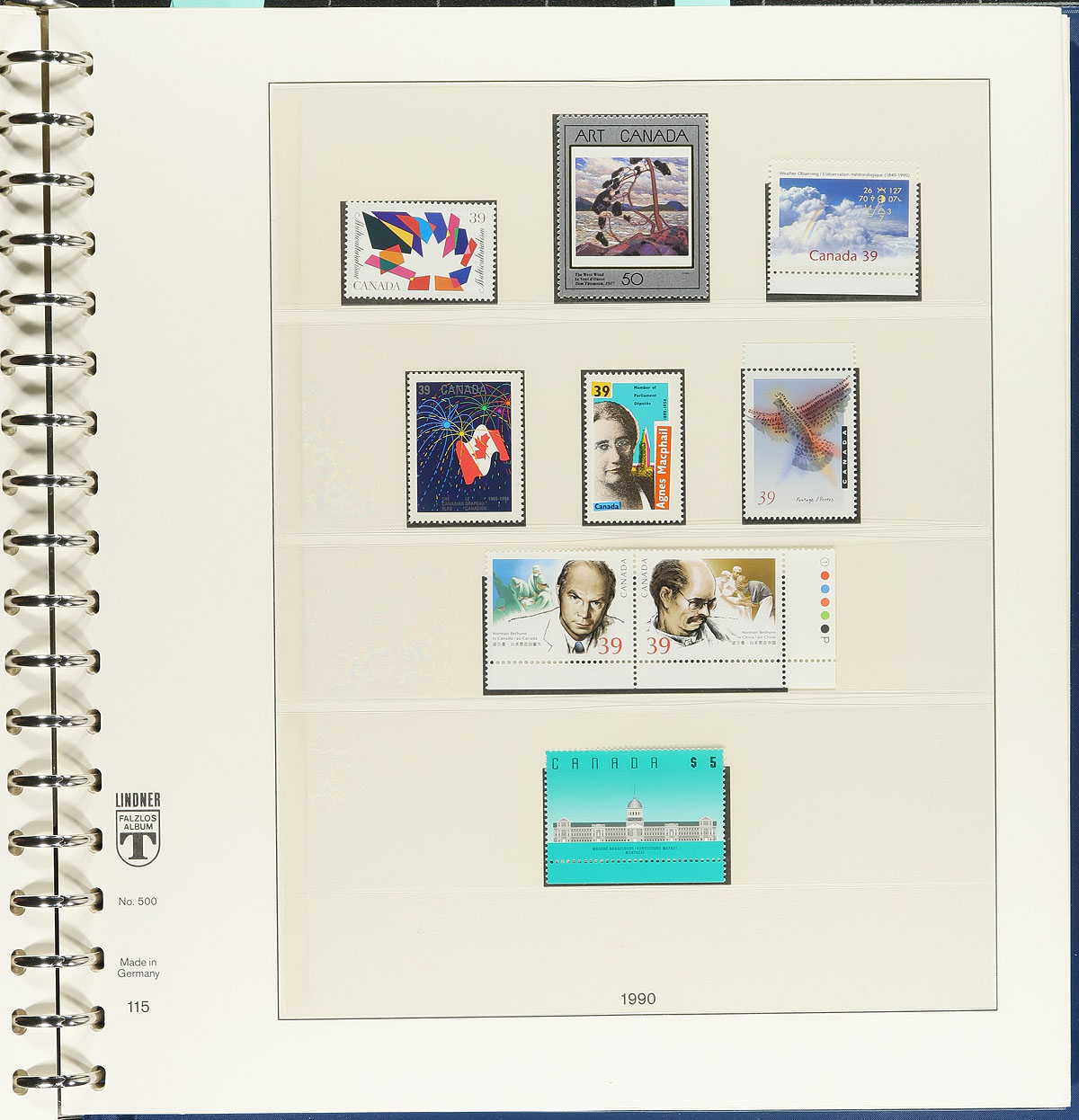 Hingeless Collection Part #3. Clean collection of never hinged Canada, in a Lindner album with slipcase, 1986-1992. This well organized collection ranges from Unitrade #1077/1455, noting a high degree of completeness, with an attempt by the owner to include souvenir sheets, plate blocks, booklet panes, paper, perforation, and tagging types (noting Mammals definitives), and minor varieties. A few items catalogue $10 and up with a face value alone totaling $259.00, with the album retailing over $200.00 on its own. A nice clean lot for collectors and dealers alike. Estimate =
