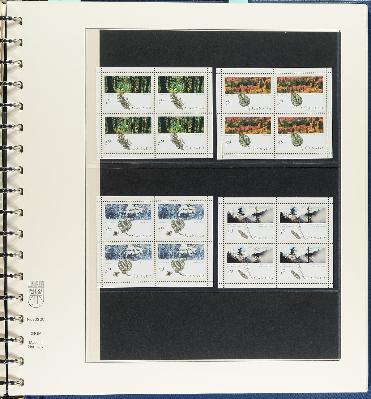 Hingeless Collection Part #3. Clean collection of never hinged Canada, in a Lindner album with slipcase, 1986-1992. This well organized collection ranges from Unitrade #1077/1455, noting a high degree of completeness, with an attempt by the owner to include souvenir sheets, plate blocks, booklet panes, paper, perforation, and tagging types (noting Mammals definitives), and minor varieties. A few items catalogue $10 and up with a face value alone totaling $259.00, with the album retailing over $200.00 on its own. A nice clean lot for collectors and dealers alike. Estimate =