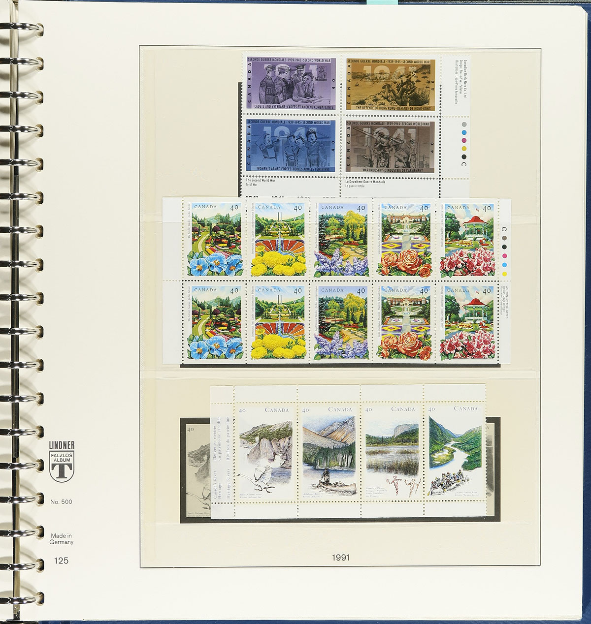 Hingeless Collection Part #3. Clean collection of never hinged Canada, in a Lindner album with slipcase, 1986-1992. This well organized collection ranges from Unitrade #1077/1455, noting a high degree of completeness, with an attempt by the owner to include souvenir sheets, plate blocks, booklet panes, paper, perforation, and tagging types (noting Mammals definitives), and minor varieties. A few items catalogue $10 and up with a face value alone totaling $259.00, with the album retailing over $200.00 on its own. A nice clean lot for collectors and dealers alike. Estimate =