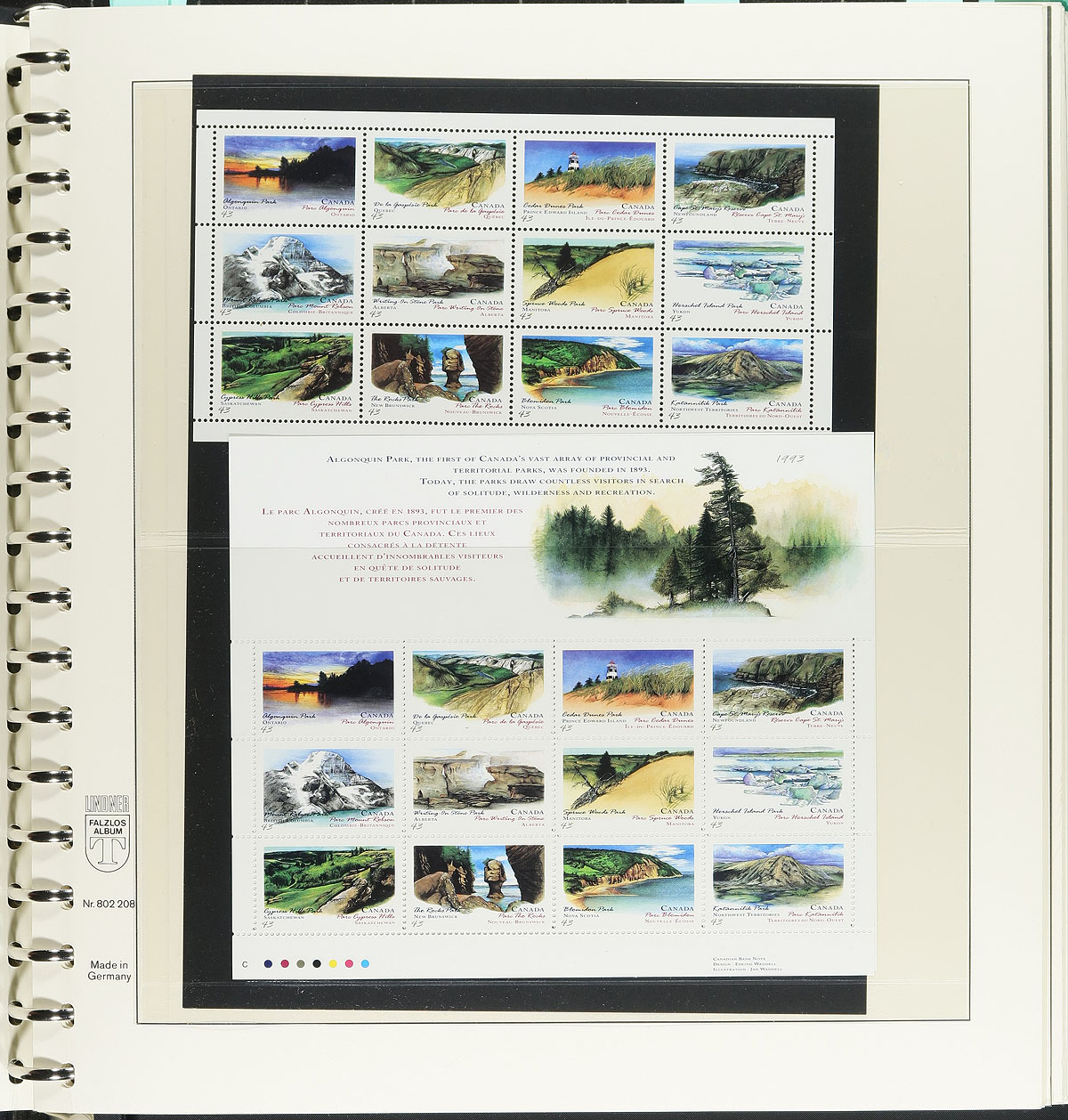 Hingeless Collection Part #4. Clean collection of never hinged Canada, in a Lindner album with slipcase, 1993-1996. This well organized collection ranges from Unitrade #1456/1626, noting a high degree of completeness, with an attempt by the owner to include souvenir sheets and sheetlets, plate blocks, booklet panes, paper, perforation, and tagging types (noting Fruit Tree definitives). A few items catalogue $10.00 and up with a face value alone totaling $326.00, with the album retailing over $200.00 on its own. A nice clean lot for collectors and dealers alike, with duplication up to 3 for a few sheetlets. Estimate =