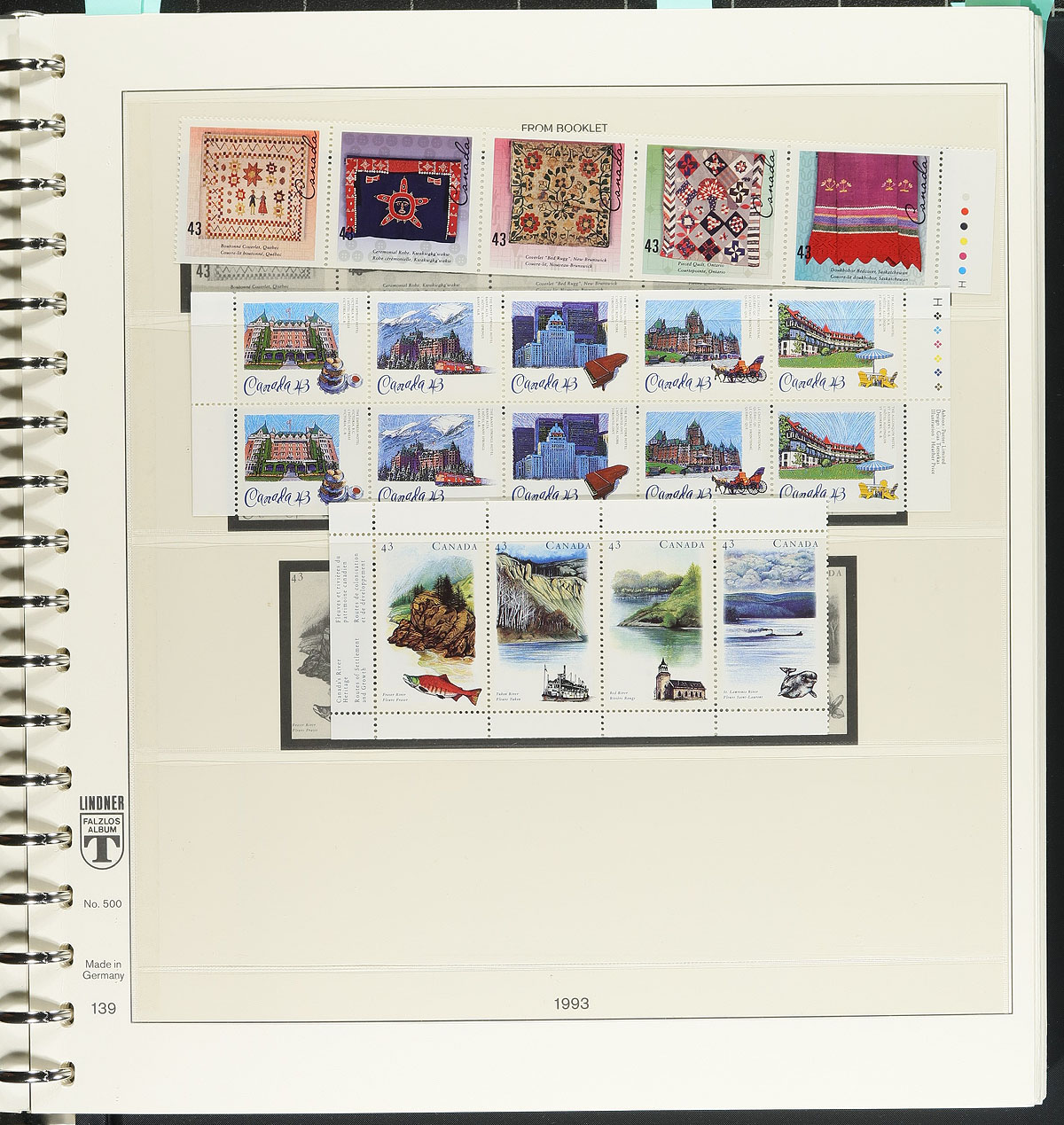 Hingeless Collection Part #4. Clean collection of never hinged Canada, in a Lindner album with slipcase, 1993-1996. This well organized collection ranges from Unitrade #1456/1626, noting a high degree of completeness, with an attempt by the owner to include souvenir sheets and sheetlets, plate blocks, booklet panes, paper, perforation, and tagging types (noting Fruit Tree definitives). A few items catalogue $10.00 and up with a face value alone totaling $326.00, with the album retailing over $200.00 on its own. A nice clean lot for collectors and dealers alike, with duplication up to 3 for a few sheetlets. Estimate =