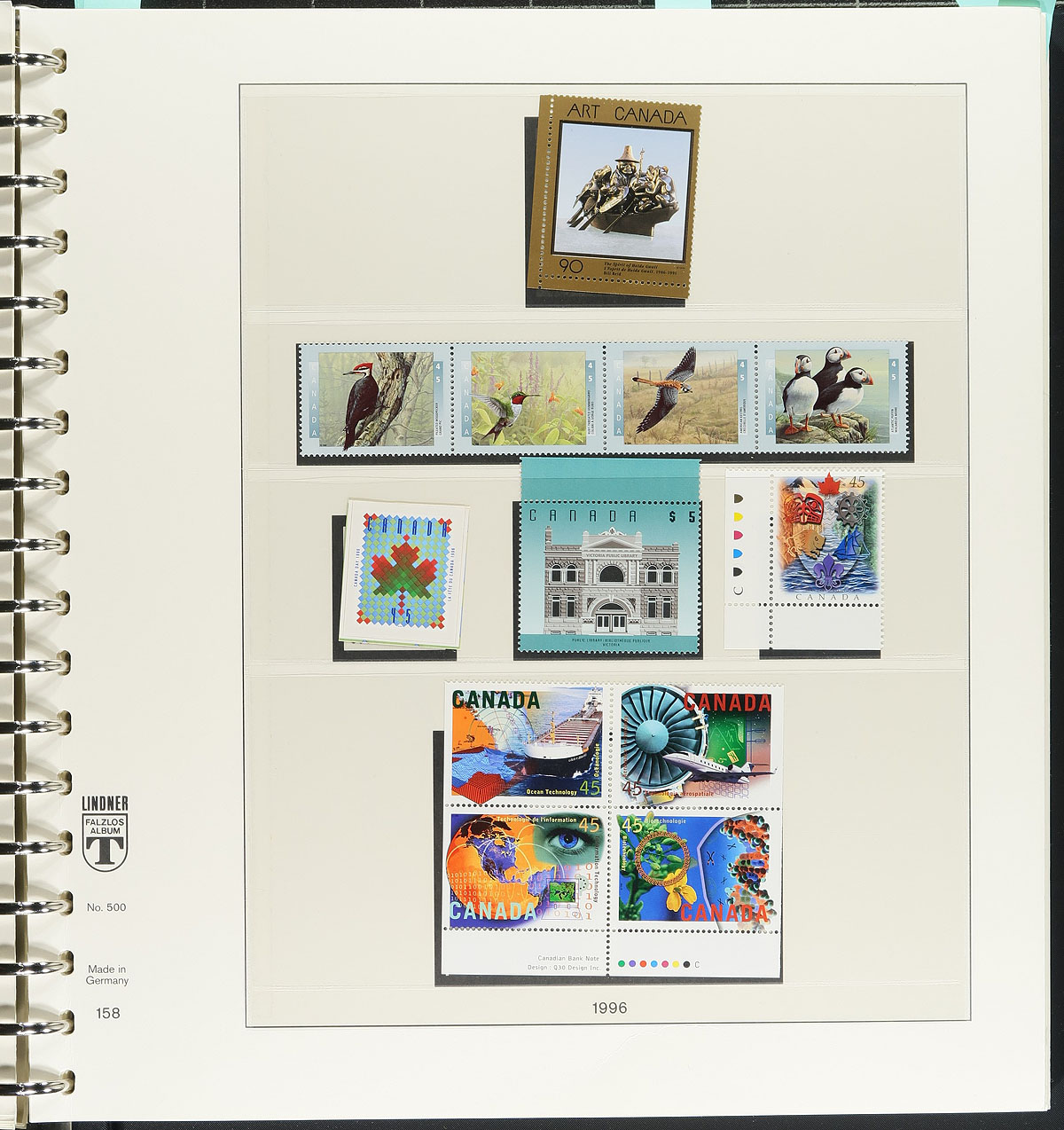 Hingeless Collection Part #4. Clean collection of never hinged Canada, in a Lindner album with slipcase, 1993-1996. This well organized collection ranges from Unitrade #1456/1626, noting a high degree of completeness, with an attempt by the owner to include souvenir sheets and sheetlets, plate blocks, booklet panes, paper, perforation, and tagging types (noting Fruit Tree definitives). A few items catalogue $10.00 and up with a face value alone totaling $326.00, with the album retailing over $200.00 on its own. A nice clean lot for collectors and dealers alike, with duplication up to 3 for a few sheetlets. Estimate =