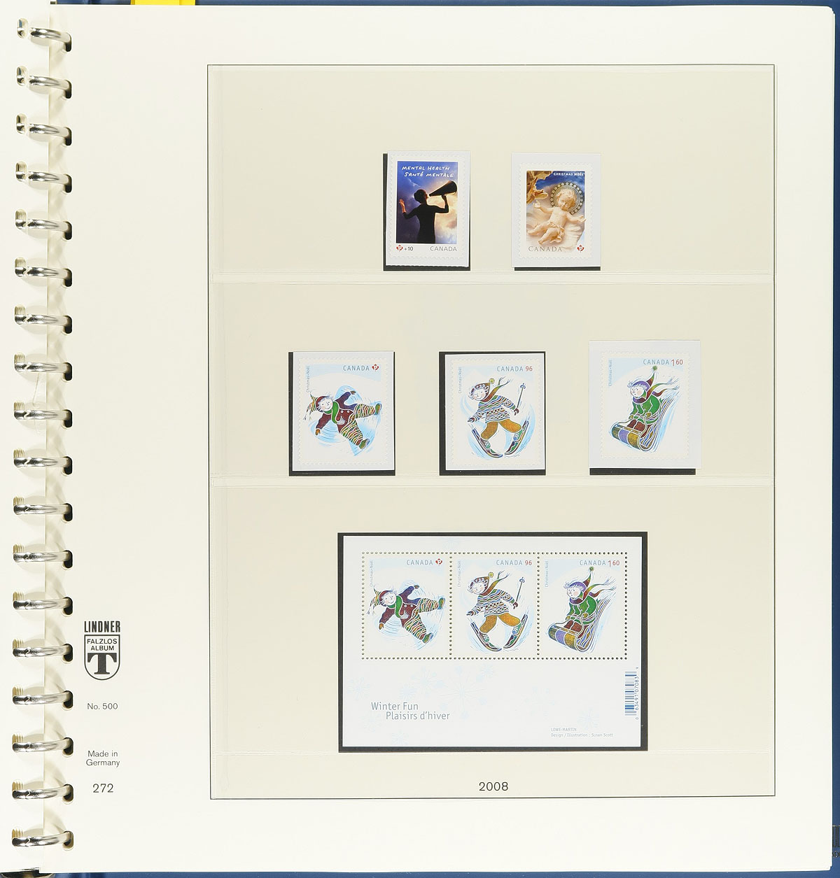 Hingeless Collection Part #7. Clean collection of never hinged Canada, in a Lindner album with slipcase, 2006-2010. This well organized collection ranges from Unitrade #2140/2411, noting a high degree of completeness, with an attempt by the owner to include souvenir sheets, sheetlets, plate blocks, booklets, paper types, etc, noting many "P" stamps that will only increase in value over time. A few items catalogue $10.00 and up with a face value alone totaling $491.00, with the album retailing over $200.00 on its own. A nice clean lot for collectors and dealers alike, with duplication up to 3 for a few sheetlets. Estimate =