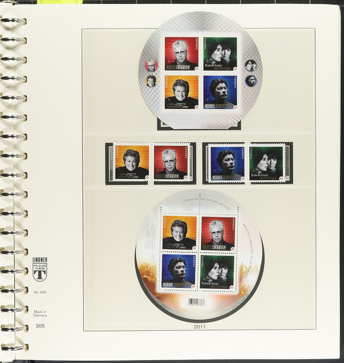 Hingeless Collection Part #8. Clean collection of never hinged Canada, in a Lindner album with slipcase, 2011-2013. This well organized collection ranges from Unitrade #2416/2687, noting a high degree of completeness, with an attempt by the owner to include souvenir sheets, sheetlets,coils and booklet stamps, etc, noting several P stamps that will only increase in value over time. A few items catalogue $10.00 and up with a face value alone totaling $567.00, with the album retailing over $200.00 on its own. A nice clean lot for collectors and dealers alike, with duplication up to 3 for a few sheetlets. Estimate =