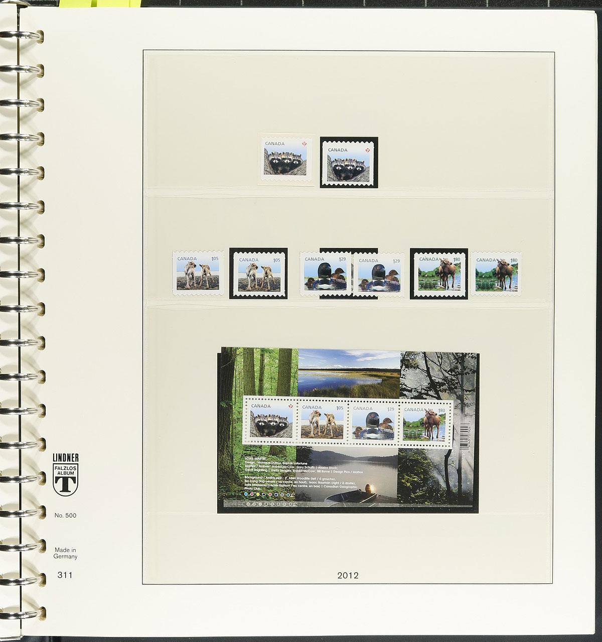 Hingeless Collection Part #8. Clean collection of never hinged Canada, in a Lindner album with slipcase, 2011-2013. This well organized collection ranges from Unitrade #2416/2687, noting a high degree of completeness, with an attempt by the owner to include souvenir sheets, sheetlets,coils and booklet stamps, etc, noting several P stamps that will only increase in value over time. A few items catalogue $10.00 and up with a face value alone totaling $567.00, with the album retailing over $200.00 on its own. A nice clean lot for collectors and dealers alike, with duplication up to 3 for a few sheetlets. Estimate =