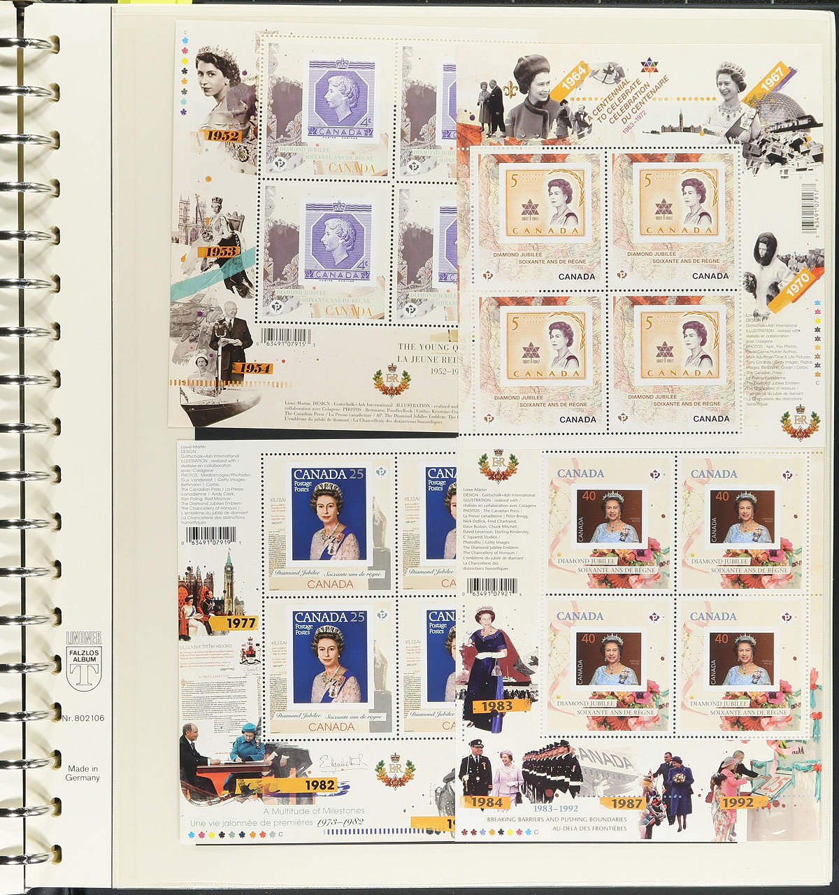 Hingeless Collection Part #8. Clean collection of never hinged Canada, in a Lindner album with slipcase, 2011-2013. This well organized collection ranges from Unitrade #2416/2687, noting a high degree of completeness, with an attempt by the owner to include souvenir sheets, sheetlets,coils and booklet stamps, etc, noting several P stamps that will only increase in value over time. A few items catalogue $10.00 and up with a face value alone totaling $567.00, with the album retailing over $200.00 on its own. A nice clean lot for collectors and dealers alike, with duplication up to 3 for a few sheetlets. Estimate =