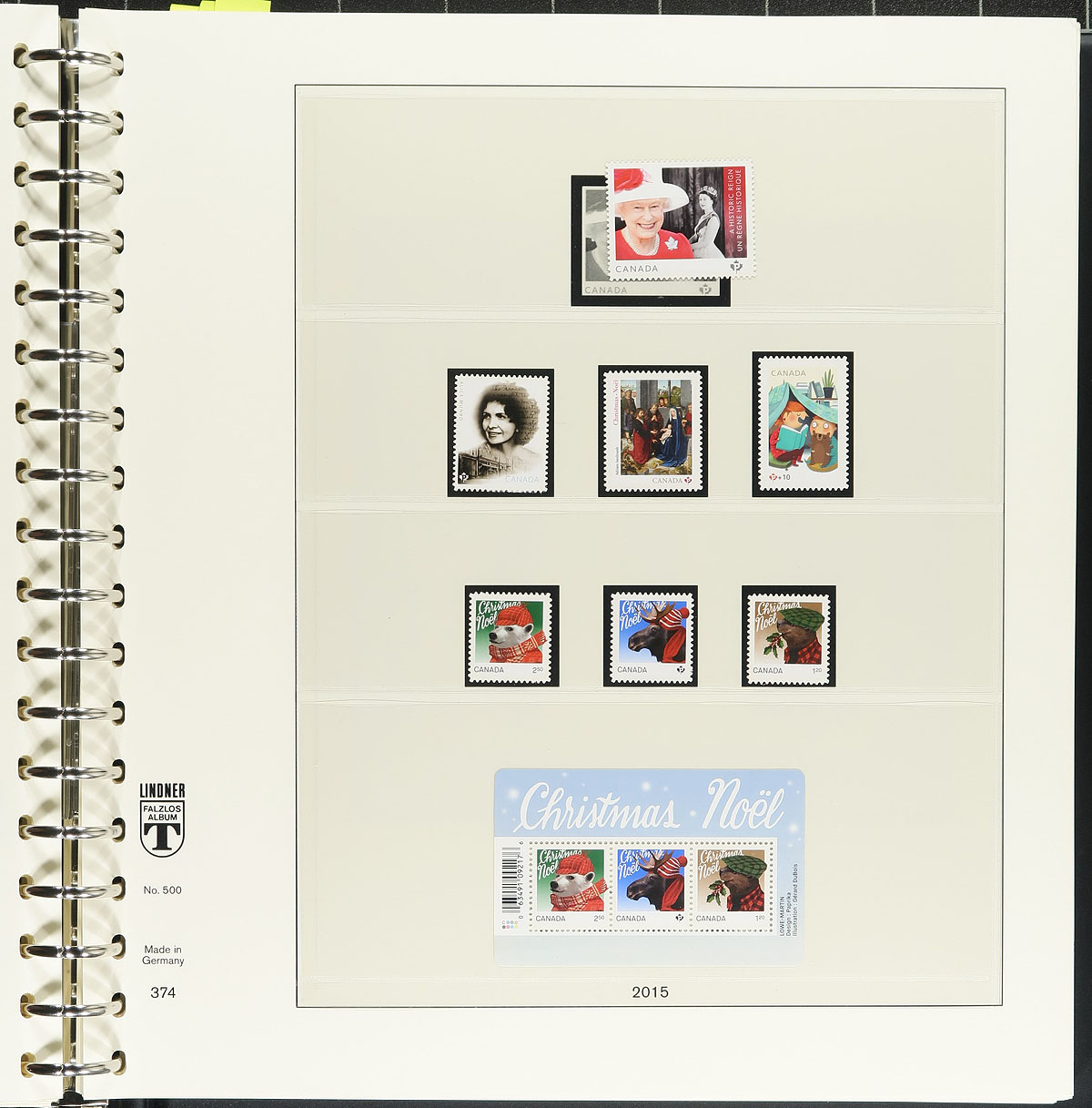 Hingeless Collection Part #9. Clean collection of never hinged Canada, in a Lindner album with slipcase, 2014-2016. This well organized collection ranges from Unitrade #2699/2954, noting a high degree of completeness, with an attempt by the owner to include souvenir sheets, sheetlets,coils and booklet stamps, etc, noting several "P" stamps that will only increase in value over time. A few items catalogue $10.00 and up with a face value alone totaling $538.00, with the album retailing over $200.00 on its own. A nice clean lot for collectors and dealers alike, with duplication up to 3 for a few sheetlets. Estimate =