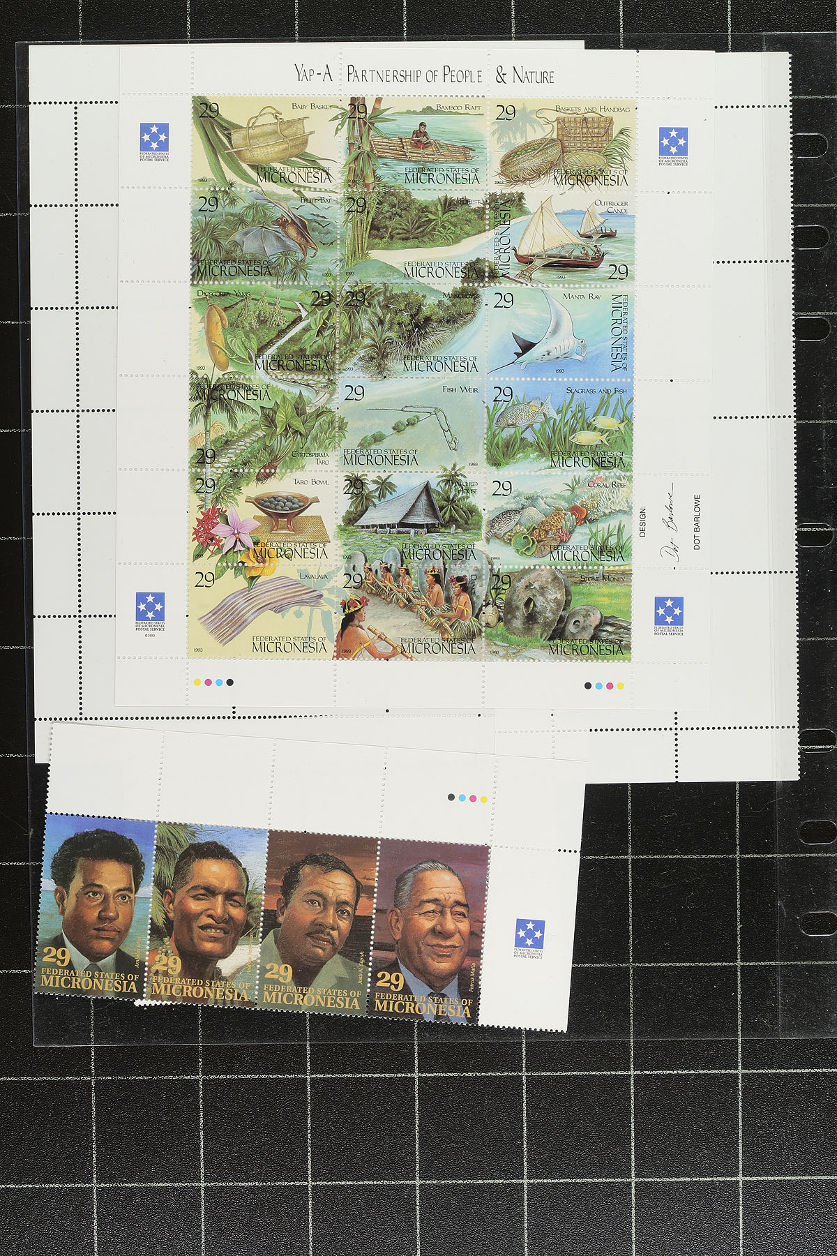Accumulation of mint and used worldwide stamps. containing several thousands of stamps in roughly 140 Vario-style, 7-row stock pages, filling a small box. A cursory check of material indicated material generally ranging from the 1930's to the 1980's, noting mostly used stamps, with some mint never hinged singles and souvenir sheets from the 1970s onwards. Better representation from European, and Pacific areas, noting Sweden, Micronesia, Christmas Island, just to name a few, leaving better finds to the worldwide collector, the stock pages alone would retail a few hundred dollars. Estimate =