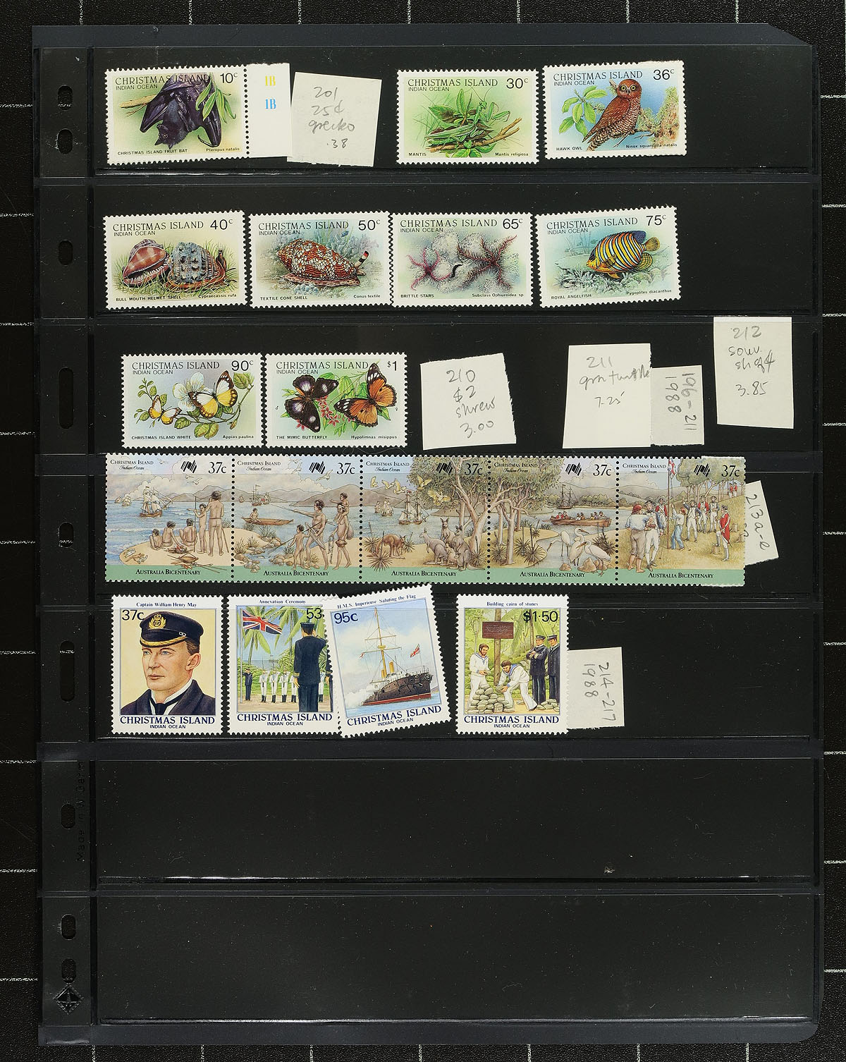 Accumulation of mint and used worldwide stamps. containing several thousands of stamps in roughly 140 Vario-style, 7-row stock pages, filling a small box. A cursory check of material indicated material generally ranging from the 1930's to the 1980's, noting mostly used stamps, with some mint never hinged singles and souvenir sheets from the 1970s onwards. Better representation from European, and Pacific areas, noting Sweden, Micronesia, Christmas Island, just to name a few, leaving better finds to the worldwide collector, the stock pages alone would retail a few hundred dollars. Estimate =