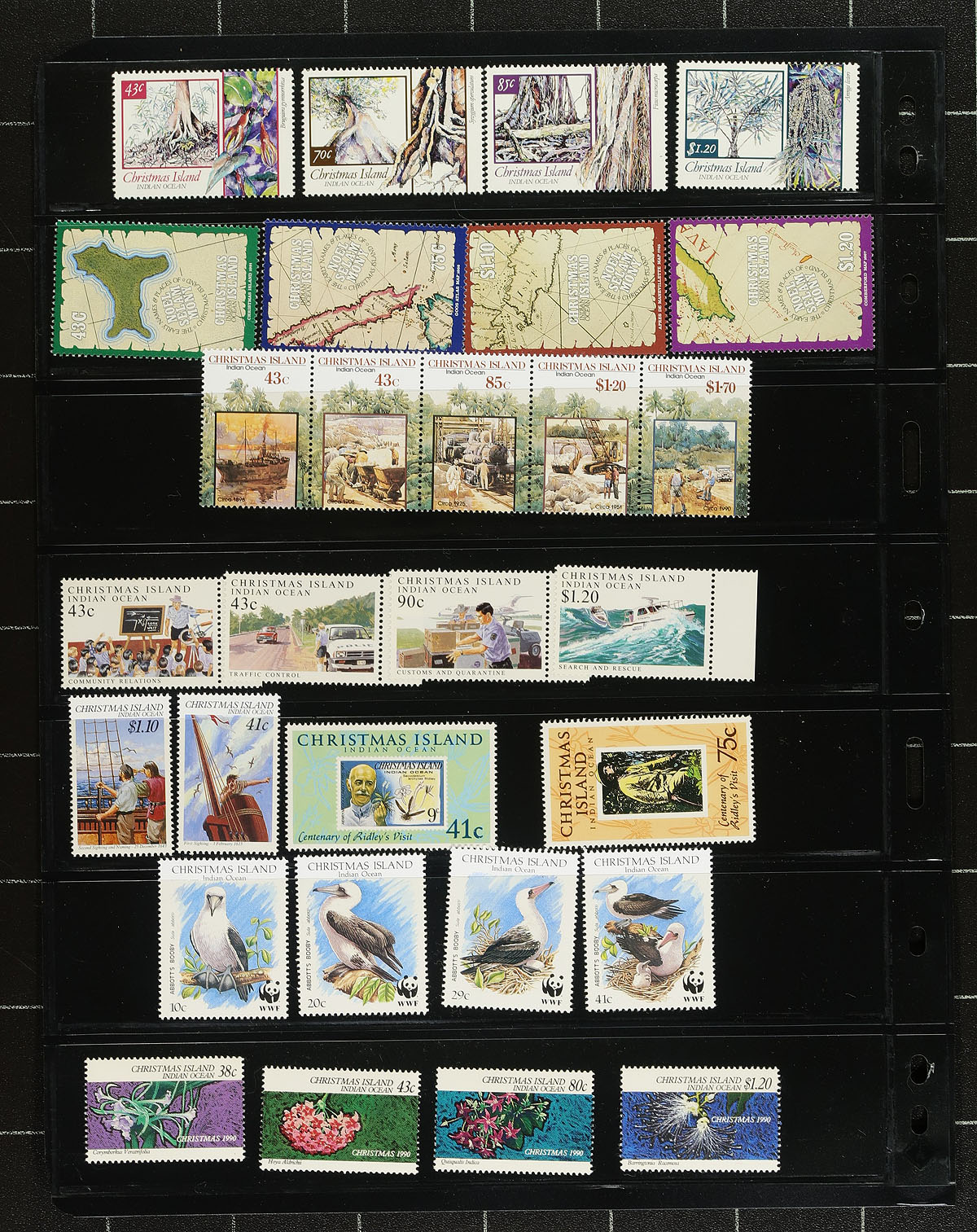 Accumulation of mint and used worldwide stamps. containing several thousands of stamps in roughly 140 Vario-style, 7-row stock pages, filling a small box. A cursory check of material indicated material generally ranging from the 1930's to the 1980's, noting mostly used stamps, with some mint never hinged singles and souvenir sheets from the 1970s onwards. Better representation from European, and Pacific areas, noting Sweden, Micronesia, Christmas Island, just to name a few, leaving better finds to the worldwide collector, the stock pages alone would retail a few hundred dollars. Estimate =
