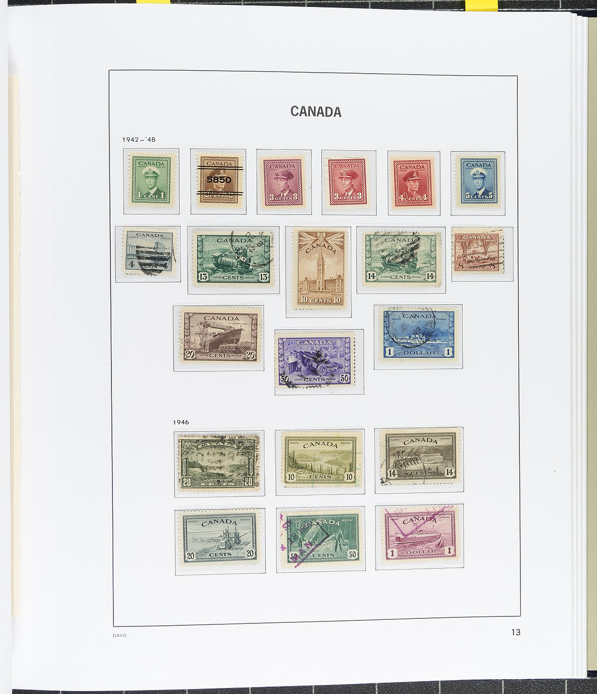 Attractive collection of mint and used Canada in 4 hingeless DAVO albums with slipcases, 1859-1992. The collection begins with used material up to the 1950's, noting Scott #s 14 (x2), 15 (x2), 17-20, a few Large Queens (1/2c, 15c (x2)), 20c and 50c Widow Weeds, along with complete sets of Leafs, Edwards, Quebecs, Admirals, Scrolls, right up to the Peace issues, along with a selection of "back of the book" material. The collection continues with a mix of mint and used material up to the early 1990's (empty pages after 1992, with hingeless pages to 2006 and additional pages for souvenir sheets and booklets). A better than average start to a great Canada collection, in albums that currently retail multiple hundreds of dollars. We note a few faults with a few early issues, and a few stamps in the wrong spots, otherwise a very nice lot with the albums alone having an original cost of several hundred dollars. Estimate =