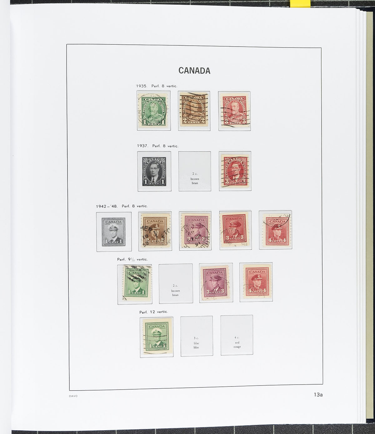 Attractive collection of mint and used Canada in 4 hingeless DAVO albums with slipcases, 1859-1992. The collection begins with used material up to the 1950's, noting Scott #s 14 (x2), 15 (x2), 17-20, a few Large Queens (1/2c, 15c (x2)), 20c and 50c Widow Weeds, along with complete sets of Leafs, Edwards, Quebecs, Admirals, Scrolls, right up to the Peace issues, along with a selection of "back of the book" material. The collection continues with a mix of mint and used material up to the early 1990's (empty pages after 1992, with hingeless pages to 2006 and additional pages for souvenir sheets and booklets). A better than average start to a great Canada collection, in albums that currently retail multiple hundreds of dollars. We note a few faults with a few early issues, and a few stamps in the wrong spots, otherwise a very nice lot with the albums alone having an original cost of several hundred dollars. Estimate =