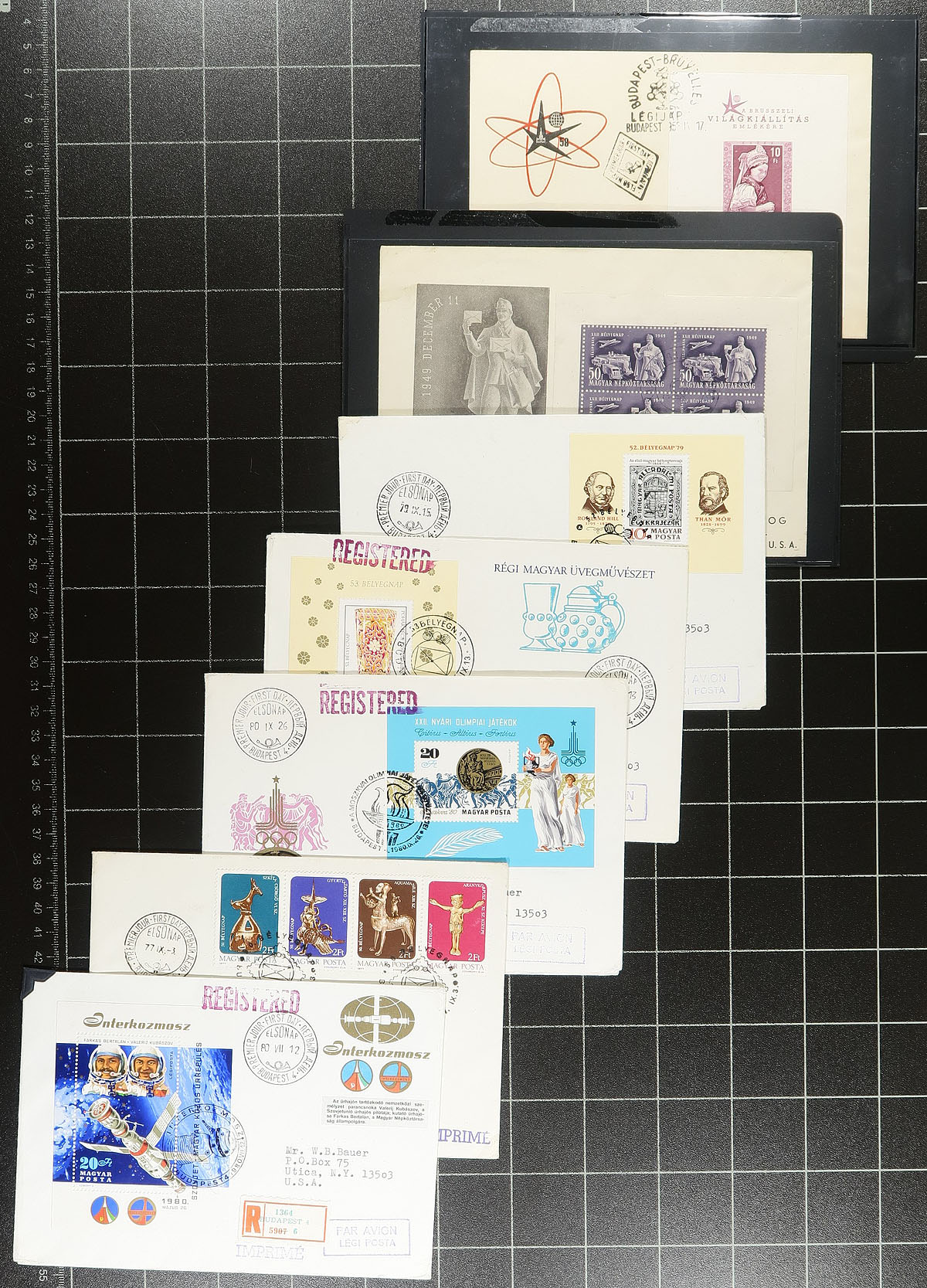 Large group of Hungary covers and cards, 1900's-2000, containing roughly 400 items, primarily from a few correspondences using mostly air letters from the 1970's to 2000, noting a wide variety of different frankings and rates. The balance of the lot contains some commercial mail, post cards, postal stationery, etc., with a few frankings (souvenir sheets), cataloguing $20 and up. A nice lot for the specialist, along with topical and thematic collectors looking for commercial mail with a wide variety of suitable subjects including space and transportation, animals, paintings, flowers, and much more. Condition ranges from mixed to very fine. Estimate =