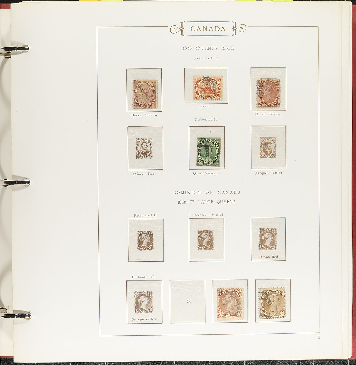 Nice starter collection of used Canada in 3 hingeless Darnell albums, 1859-1994. The collection begins with used issues with Scott #s 14-15, 18, 20, 25, 27-28, 30 (x2), Small Queens (x32, including 10c (x2), 20c and 50c Widow Weeds), complete set of Edwards, along, with partial sets of Leafs, Numerals, Quebecs, Scrolls (includes 50c Bluenose), onwards, with a few mint items scattered within. The collection essentially ends in 1983, with pages up to 1994, along with additional pages for Conservation stamps. A nice start to a Canada collection in three lovely albums that retail at least a few hundred dollars. A few faults with a few of the early stamps, overall fine to very fine. Estimate =
