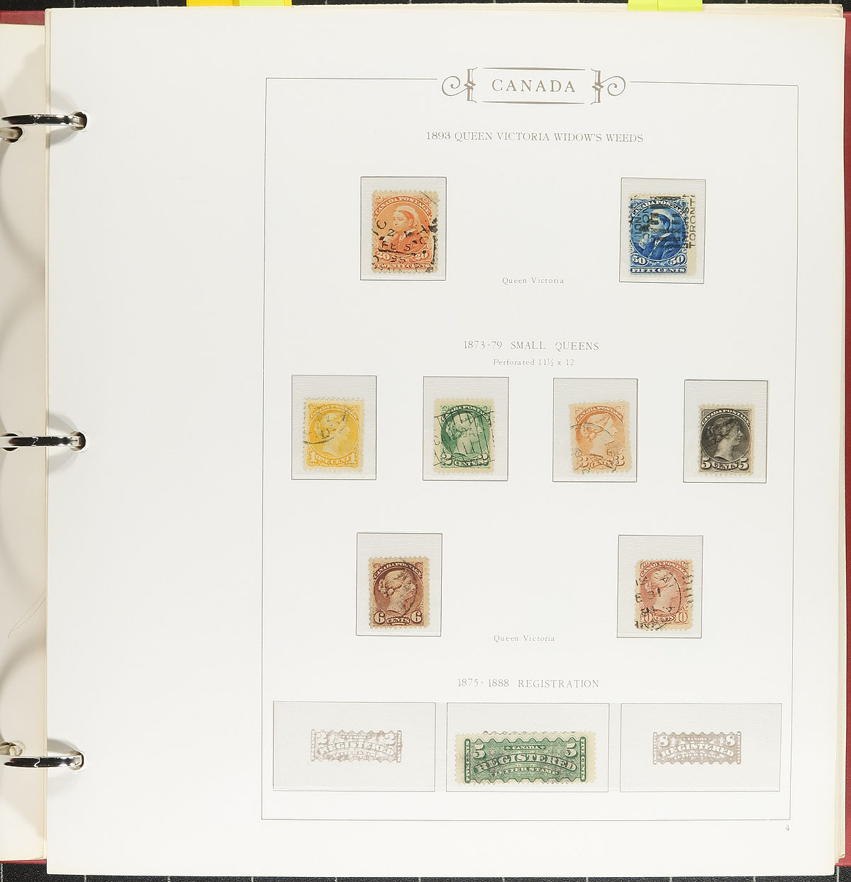 Nice starter collection of used Canada in 3 hingeless Darnell albums, 1859-1994. The collection begins with used issues with Scott #s 14-15, 18, 20, 25, 27-28, 30 (x2), Small Queens (x32, including 10c (x2), 20c and 50c Widow Weeds), complete set of Edwards, along, with partial sets of Leafs, Numerals, Quebecs, Scrolls (includes 50c Bluenose), onwards, with a few mint items scattered within. The collection essentially ends in 1983, with pages up to 1994, along with additional pages for Conservation stamps. A nice start to a Canada collection in three lovely albums that retail at least a few hundred dollars. A few faults with a few of the early stamps, overall fine to very fine. Estimate =