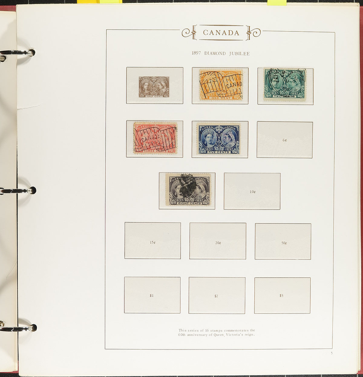 Nice starter collection of used Canada in 3 hingeless Darnell albums, 1859-1994. The collection begins with used issues with Scott #s 14-15, 18, 20, 25, 27-28, 30 (x2), Small Queens (x32, including 10c (x2), 20c and 50c Widow Weeds), complete set of Edwards, along, with partial sets of Leafs, Numerals, Quebecs, Scrolls (includes 50c Bluenose), onwards, with a few mint items scattered within. The collection essentially ends in 1983, with pages up to 1994, along with additional pages for Conservation stamps. A nice start to a Canada collection in three lovely albums that retail at least a few hundred dollars. A few faults with a few of the early stamps, overall fine to very fine. Estimate =