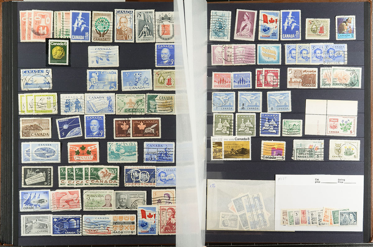Very interesting stock of primarily used Canada, 1859-1990's, with many hundreds of stamps in a 32 page stockbook. There is quite a bit to digest here, as we note early issues with Scott #s 14 (x5). 15 (x5), 17, 18, 25, 26, roughly 45 Small Queens (including 10c, and both Widow Weeds), Jubilees up to the 8c, along with complete sets and accumulations of Leafs, Numerals, Edwards, Maps, Admirals, part sets of Scrolls, with full sets of Arch, Pictorials, and much more. The lot includes mint examples of Numerals, Admirals and more, with a spot check indicating mint hinged or no gum. A potentially high cataloguing lot, noting some cds "socked on the nose" town cancels, a few small faults expected, with all pages photographed online. Estimate =