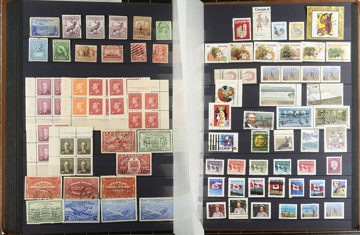 Very interesting stock of primarily used Canada, 1859-1990's, with many hundreds of stamps in a 32 page stockbook. There is quite a bit to digest here, as we note early issues with Scott #s 14 (x5). 15 (x5), 17, 18, 25, 26, roughly 45 Small Queens (including 10c, and both Widow Weeds), Jubilees up to the 8c, along with complete sets and accumulations of Leafs, Numerals, Edwards, Maps, Admirals, part sets of Scrolls, with full sets of Arch, Pictorials, and much more. The lot includes mint examples of Numerals, Admirals and more, with a spot check indicating mint hinged or no gum. A potentially high cataloguing lot, noting some cds "socked on the nose" town cancels, a few small faults expected, with all pages photographed online. Estimate =