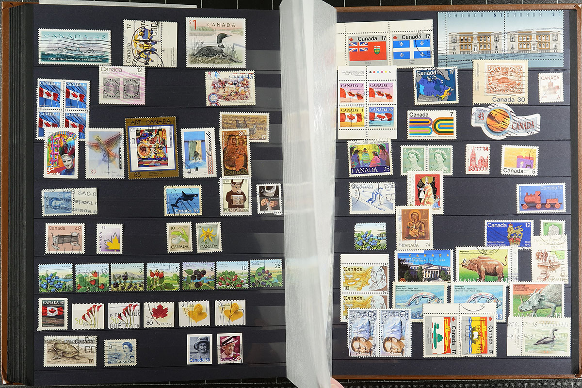 Very interesting stock of primarily used Canada, 1859-1990's, with many hundreds of stamps in a 32 page stockbook. There is quite a bit to digest here, as we note early issues with Scott #s 14 (x5). 15 (x5), 17, 18, 25, 26, roughly 45 Small Queens (including 10c, and both Widow Weeds), Jubilees up to the 8c, along with complete sets and accumulations of Leafs, Numerals, Edwards, Maps, Admirals, part sets of Scrolls, with full sets of Arch, Pictorials, and much more. The lot includes mint examples of Numerals, Admirals and more, with a spot check indicating mint hinged or no gum. A potentially high cataloguing lot, noting some cds "socked on the nose" town cancels, a few small faults expected, with all pages photographed online. Estimate =