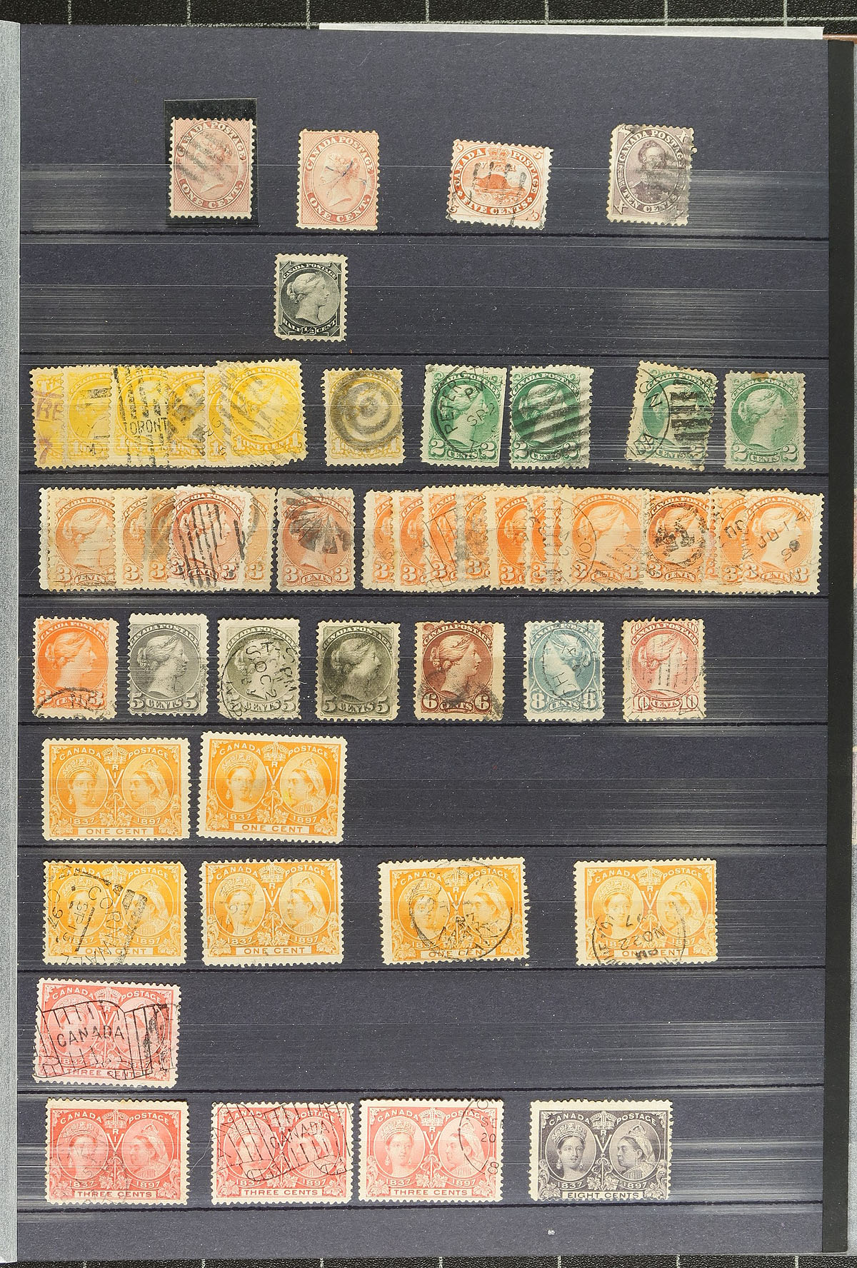 Very interesting stock of primarily used Canada, 1859-1990's, with many hundreds of stamps in a 32 page stockbook. There is quite a bit to digest here, as we note early issues with Scott #s 14 (x5). 15 (x5), 17, 18, 25, 26, roughly 45 Small Queens (including 10c, and both Widow Weeds), Jubilees up to the 8c, along with complete sets and accumulations of Leafs, Numerals, Edwards, Maps, Admirals, part sets of Scrolls, with full sets of Arch, Pictorials, and much more. The lot includes mint examples of Numerals, Admirals and more, with a spot check indicating mint hinged or no gum. A potentially high cataloguing lot, noting some cds "socked on the nose" town cancels, a few small faults expected, with all pages photographed online. Estimate =