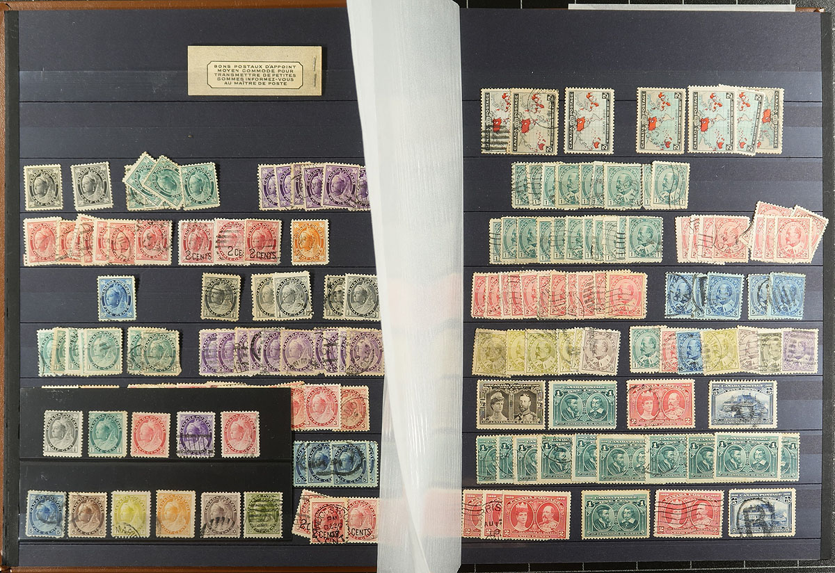 Very interesting stock of primarily used Canada, 1859-1990's, with many hundreds of stamps in a 32 page stockbook. There is quite a bit to digest here, as we note early issues with Scott #s 14 (x5). 15 (x5), 17, 18, 25, 26, roughly 45 Small Queens (including 10c, and both Widow Weeds), Jubilees up to the 8c, along with complete sets and accumulations of Leafs, Numerals, Edwards, Maps, Admirals, part sets of Scrolls, with full sets of Arch, Pictorials, and much more. The lot includes mint examples of Numerals, Admirals and more, with a spot check indicating mint hinged or no gum. A potentially high cataloguing lot, noting some cds "socked on the nose" town cancels, a few small faults expected, with all pages photographed online. Estimate =