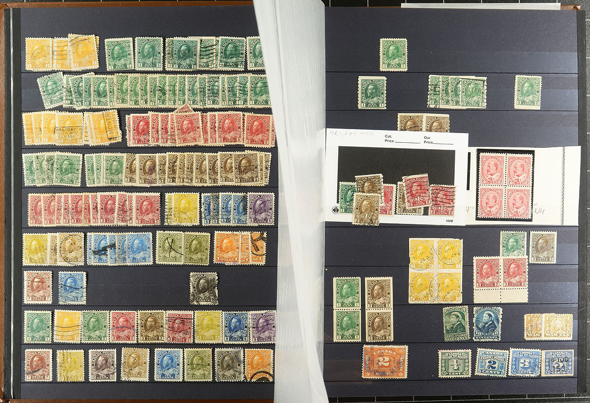 Very interesting stock of primarily used Canada, 1859-1990's, with many hundreds of stamps in a 32 page stockbook. There is quite a bit to digest here, as we note early issues with Scott #s 14 (x5). 15 (x5), 17, 18, 25, 26, roughly 45 Small Queens (including 10c, and both Widow Weeds), Jubilees up to the 8c, along with complete sets and accumulations of Leafs, Numerals, Edwards, Maps, Admirals, part sets of Scrolls, with full sets of Arch, Pictorials, and much more. The lot includes mint examples of Numerals, Admirals and more, with a spot check indicating mint hinged or no gum. A potentially high cataloguing lot, noting some cds "socked on the nose" town cancels, a few small faults expected, with all pages photographed online. Estimate =