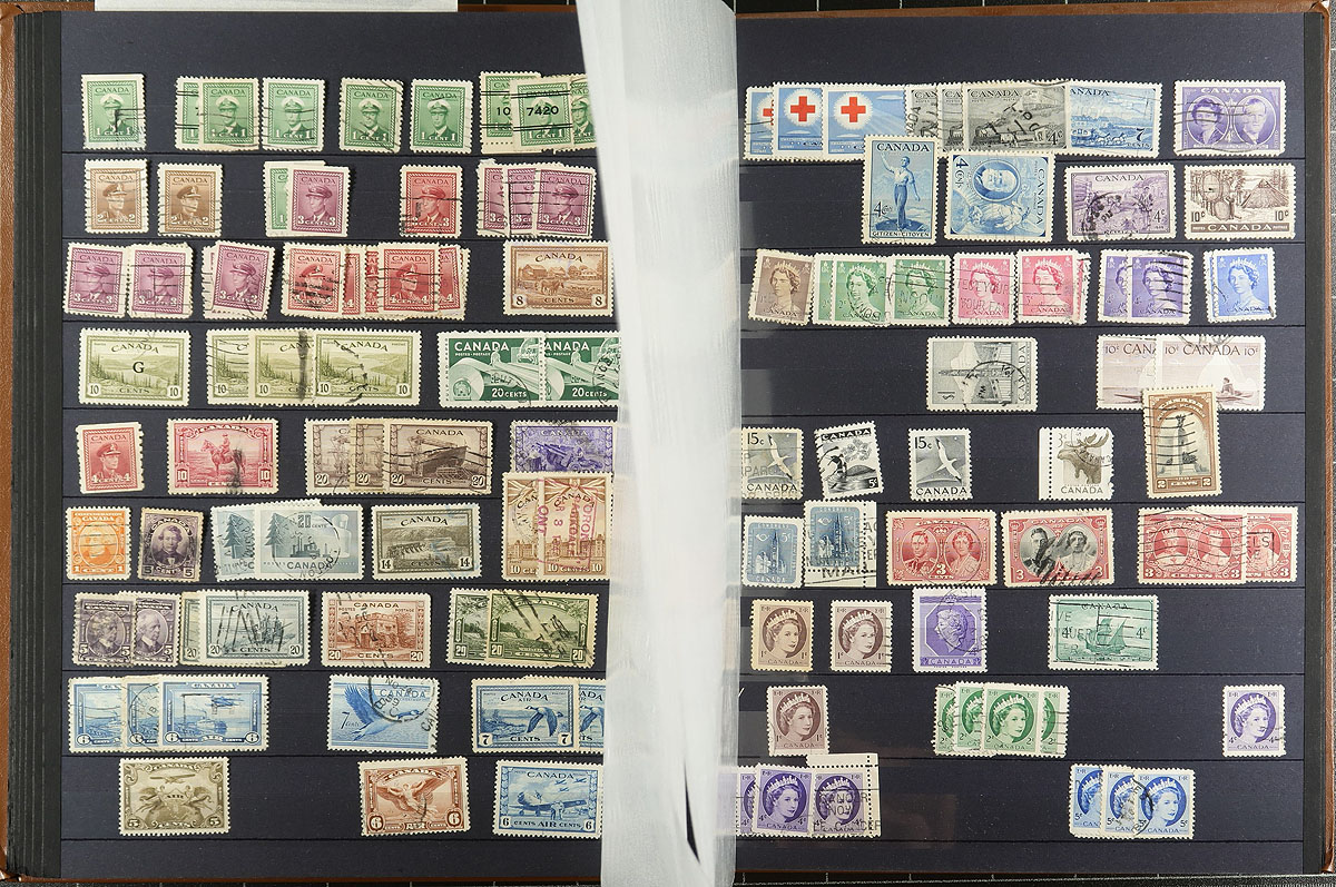 Very interesting stock of primarily used Canada, 1859-1990's, with many hundreds of stamps in a 32 page stockbook. There is quite a bit to digest here, as we note early issues with Scott #s 14 (x5). 15 (x5), 17, 18, 25, 26, roughly 45 Small Queens (including 10c, and both Widow Weeds), Jubilees up to the 8c, along with complete sets and accumulations of Leafs, Numerals, Edwards, Maps, Admirals, part sets of Scrolls, with full sets of Arch, Pictorials, and much more. The lot includes mint examples of Numerals, Admirals and more, with a spot check indicating mint hinged or no gum. A potentially high cataloguing lot, noting some cds "socked on the nose" town cancels, a few small faults expected, with all pages photographed online. Estimate =