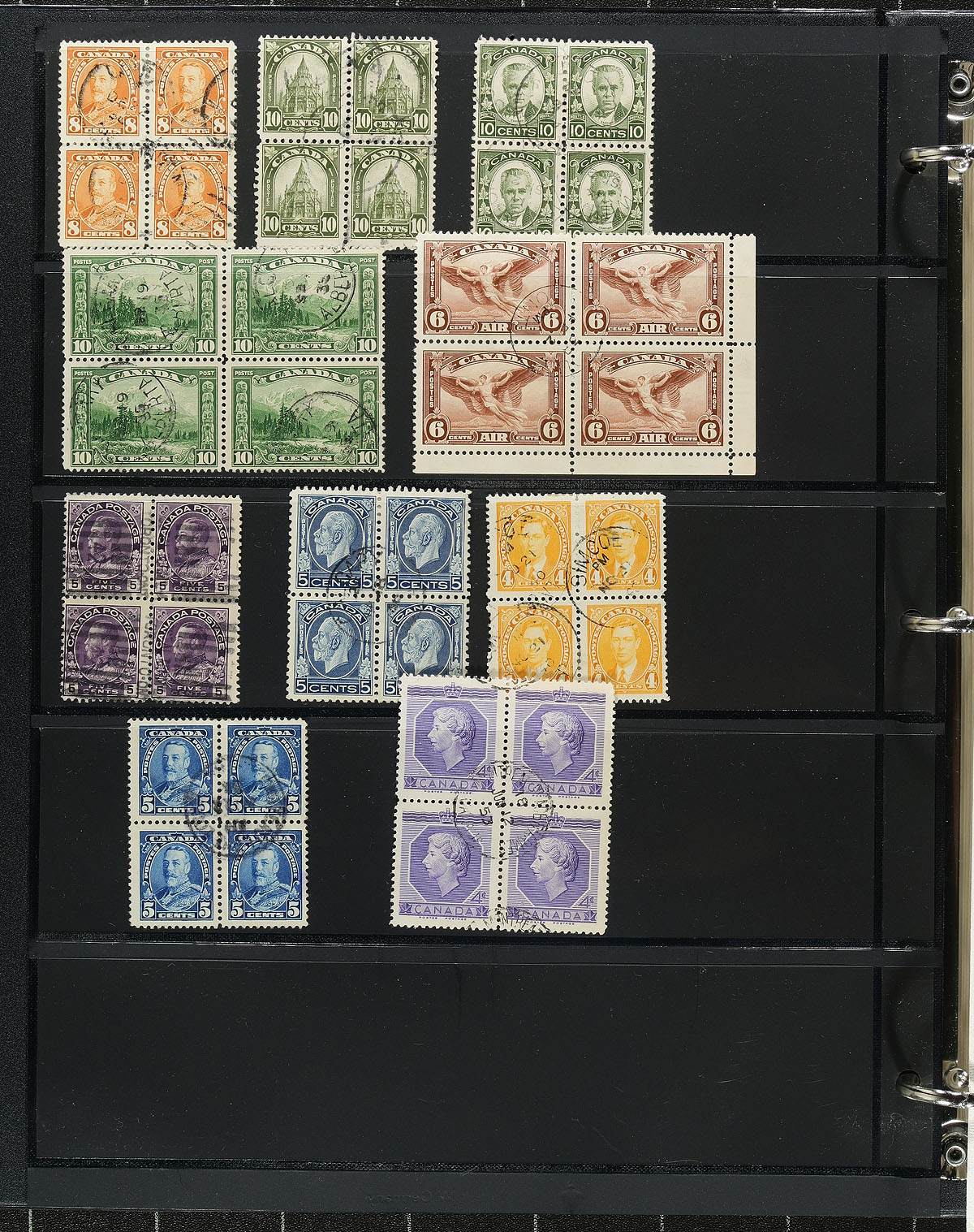 Nice accumulation of used Canada 1890's-1999, containing a few thousand stamps in 3 stockbooks and in stock or album pages in two binders. The bulk of the material is in the 3 stockbooks, primarily from the Leaf issues onwards, including blocks of 4 from the 1910's to the 1940's, modern souvenir sheets and sheetlets, with nice runs of modern used from the 1990s. A nice lot for the used collector. Estimate =