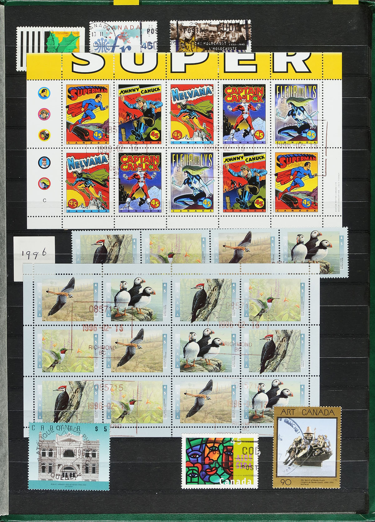 Nice accumulation of used Canada 1890's-1999, containing a few thousand stamps in 3 stockbooks and in stock or album pages in two binders. The bulk of the material is in the 3 stockbooks, primarily from the Leaf issues onwards, including blocks of 4 from the 1910's to the 1940's, modern souvenir sheets and sheetlets, with nice runs of modern used from the 1990s. A nice lot for the used collector. Estimate =