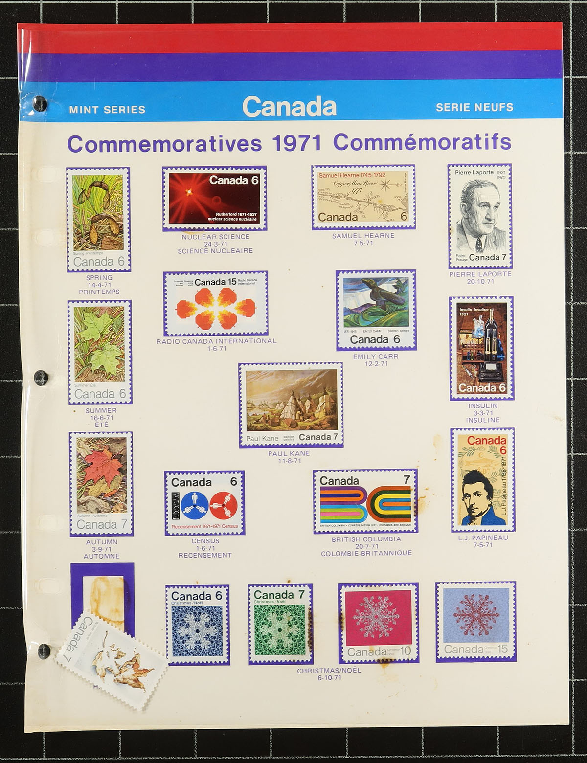 Unusual Post Office Printed Stamp Album 1966-1971. A red 3-ring binder, filled with pre-printed pages produced by Canada Post with mint stamps hinged in-place for the 1966-1971 period. Includes regular issues, Winnipeg Tagged and Postal Scrip stamps. This is the first we have seen, with binder and all pages with the trademark (and nostalgic) red, purple and blue stripe branding. Very unusual. Don't wait for another one of these to surface! Estimate =