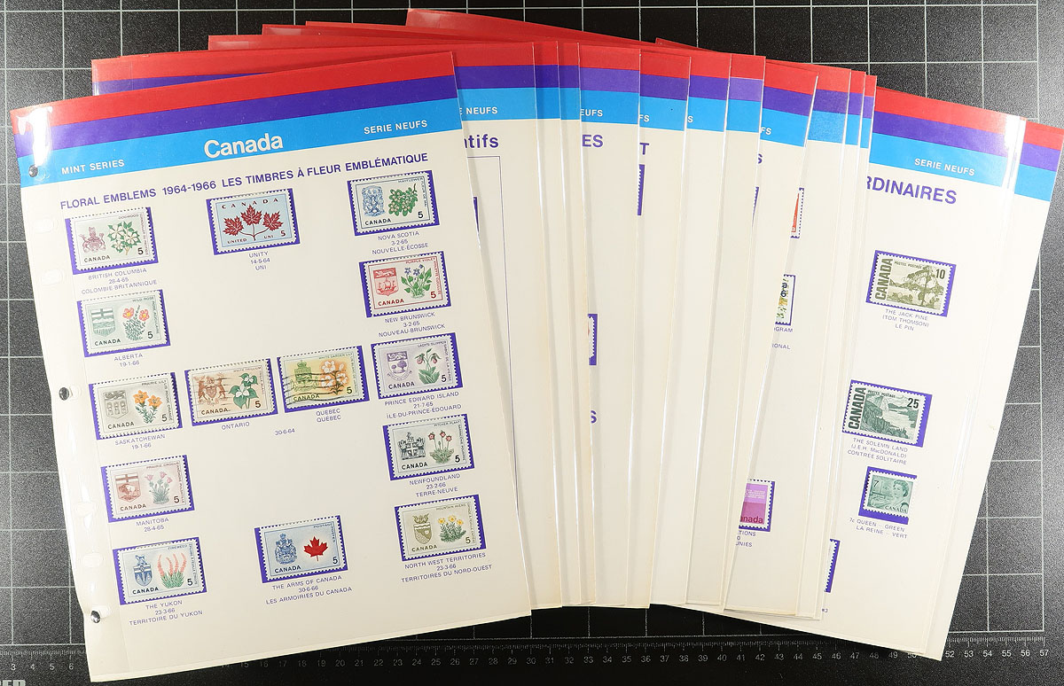 Unusual Post Office Printed Stamp Album 1966-1971. A red 3-ring binder, filled with pre-printed pages produced by Canada Post with mint stamps hinged in-place for the 1966-1971 period. Includes regular issues, Winnipeg Tagged and Postal Scrip stamps. This is the first we have seen, with binder and all pages with the trademark (and nostalgic) red, purple and blue stripe branding. Very unusual. Don't wait for another one of these to surface! Estimate =
