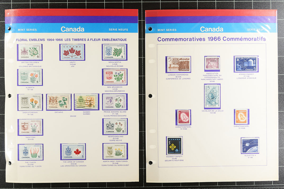 Unusual Post Office Printed Stamp Album 1966-1971. A red 3-ring binder, filled with pre-printed pages produced by Canada Post with mint stamps hinged in-place for the 1966-1971 period. Includes regular issues, Winnipeg Tagged and Postal Scrip stamps. This is the first we have seen, with binder and all pages with the trademark (and nostalgic) red, purple and blue stripe branding. Very unusual. Don't wait for another one of these to surface! Estimate =