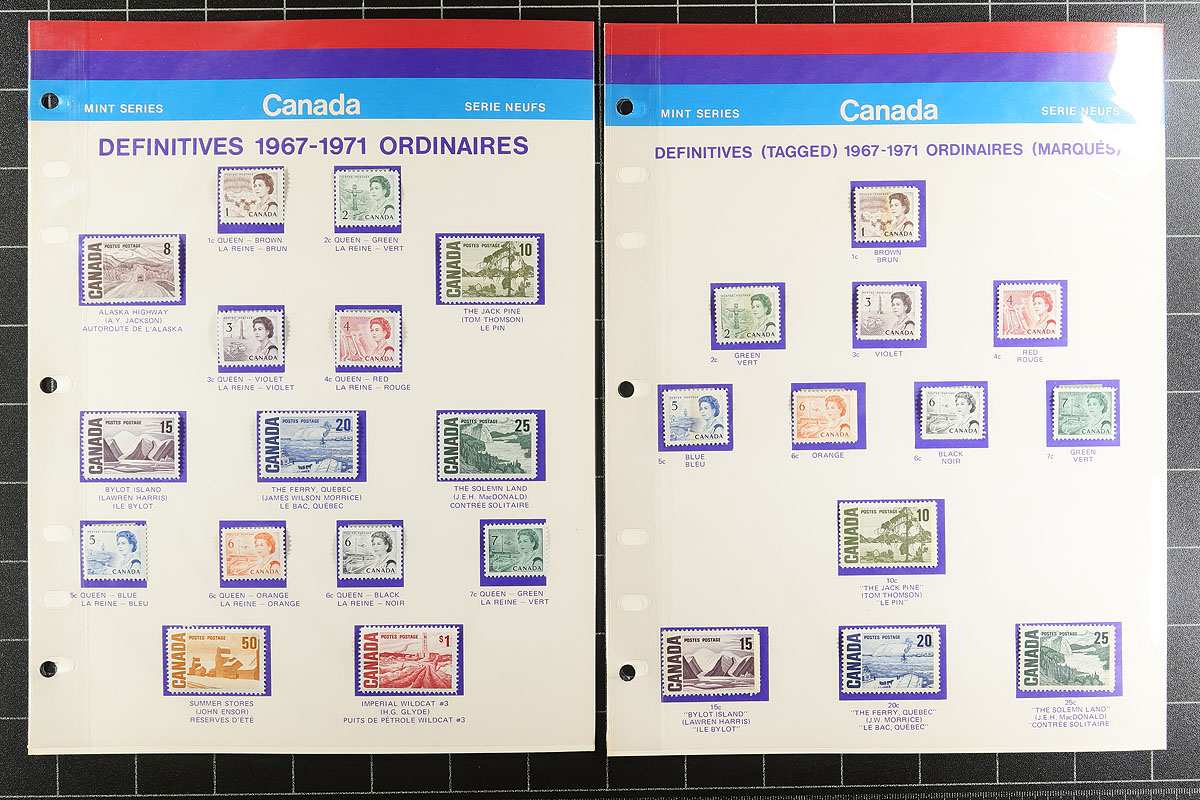 Unusual Post Office Printed Stamp Album 1966-1971. A red 3-ring binder, filled with pre-printed pages produced by Canada Post with mint stamps hinged in-place for the 1966-1971 period. Includes regular issues, Winnipeg Tagged and Postal Scrip stamps. This is the first we have seen, with binder and all pages with the trademark (and nostalgic) red, purple and blue stripe branding. Very unusual. Don't wait for another one of these to surface! Estimate =