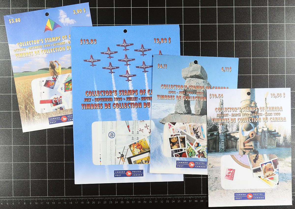 Quarterly Packs. Pristine lot of Quarterly Packs complete for the years 1995-1999 inclusive (19 packs, 1995 only had 3 packs issue, Jan-Jun, July-Sept, Oct-Dec), sealed and with all of the issues for the period, as well as se-tenant blocks and souvenir sheets. These are now listed in Unitrade but not yet priced, conservatively grouped / counted by the original purchase price. Many of these packs sold originally for less than $10.00 and are usually offered at large premium online. Original Canada Post cost =